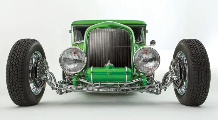 Remember that Jordan started out working at his uncle’s body shop when he was 13 years old, and he went on to become a master painter by the time he was 18. After a 30-year hiatus, he laid down the awesome color you see here. He started with painting everything base white, and then mixed a batch of House of Kolor Lime Time Green, added a little House of Kolor Pagan Gold Kandy concentrate with a pinch of Egyptian Gold pearl, and covered the white. Next he covered it with multiple coats of clear and had Pete “Hot Dog” Finlan lay down pinstriping and lettering. Finally, Jordan buried everything with six coats of clear. A grand total of 18 coats of color and clear consume this ’30 Ford five-window coupe.