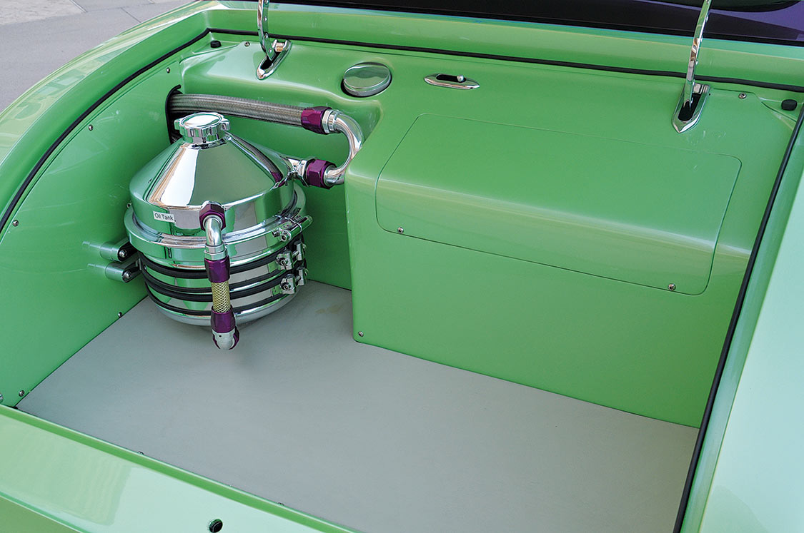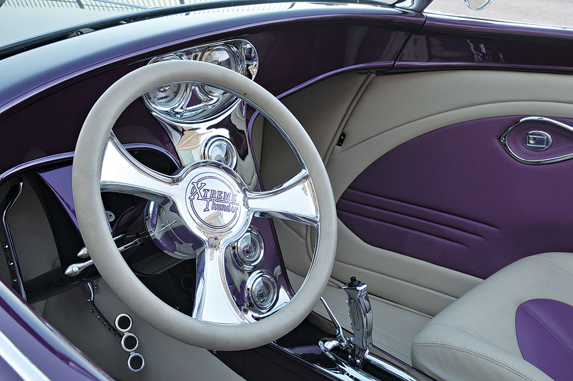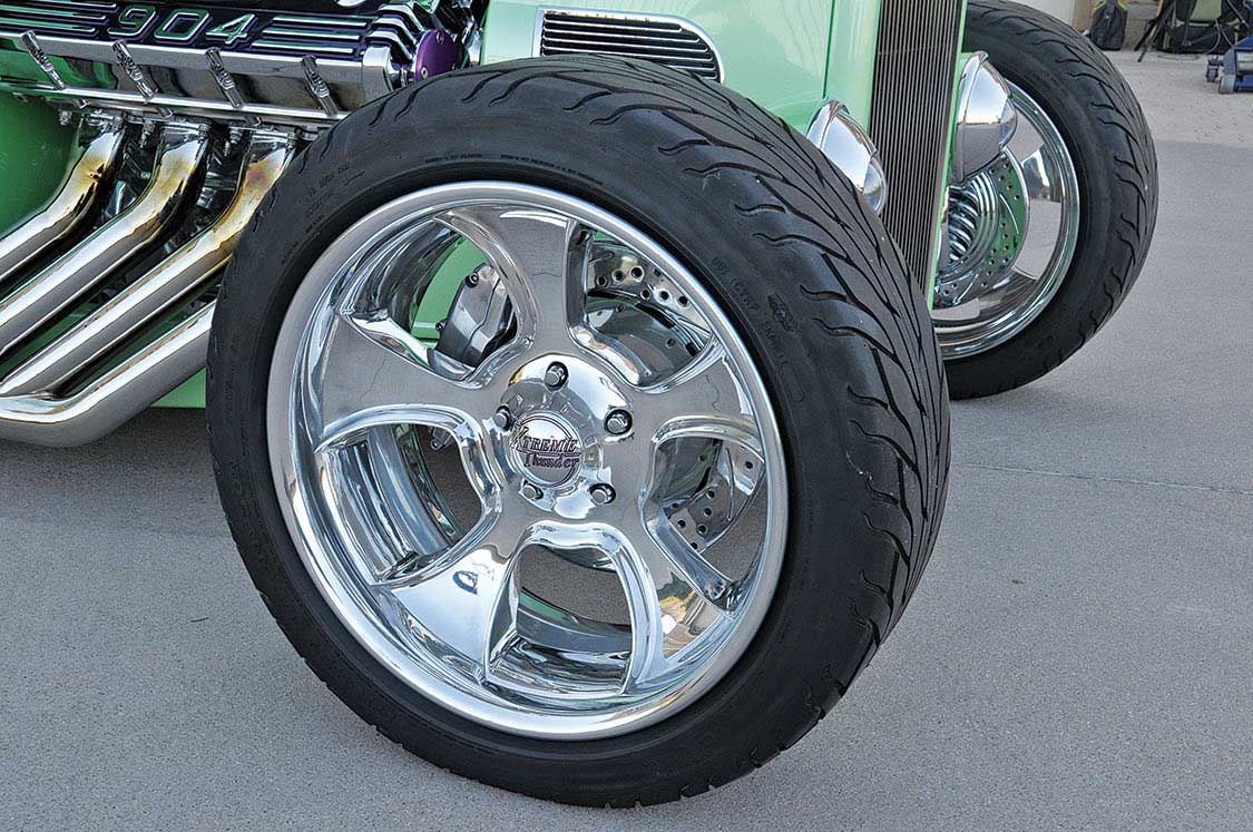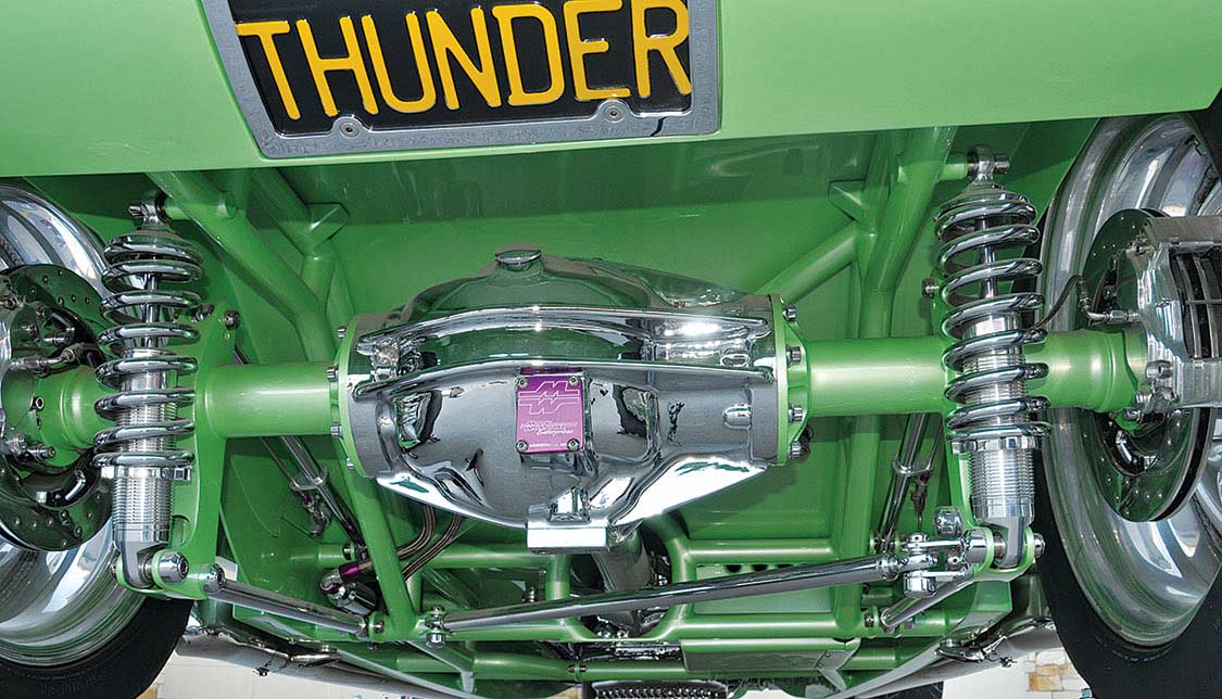 The differential, built by Currie, has a 3.58:1 ratio. A GearVendors overdrive allows for a final ratio of 2.7:1. The differential housing and axles were made by Mark Williams. The tube and reproduction 1932 box rail chassis, built at Boyd’s, has independent front suspension with Aldan shocks. The wheels are custom one-offs made by Evod Industries. Mickey Thompson tires cover the 18 x 8 wheels in the front and the 20 x 15 wheels in the rear.