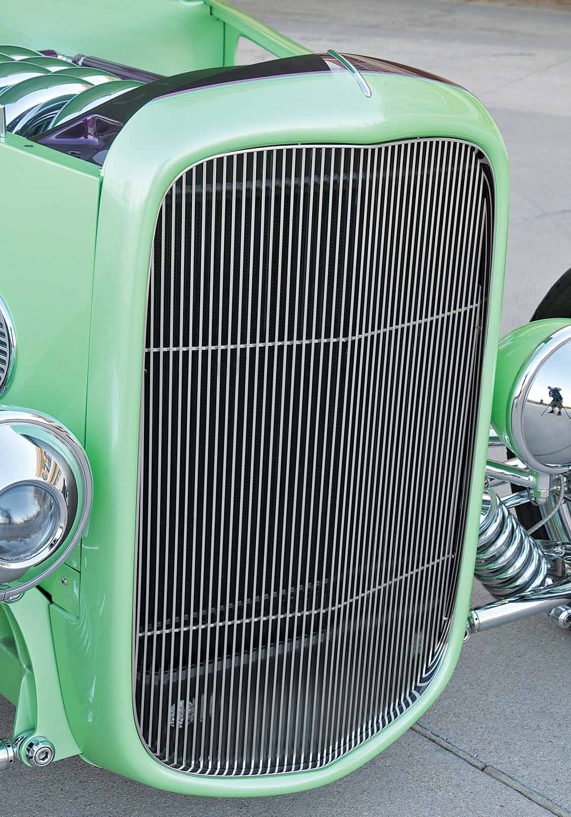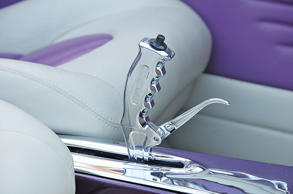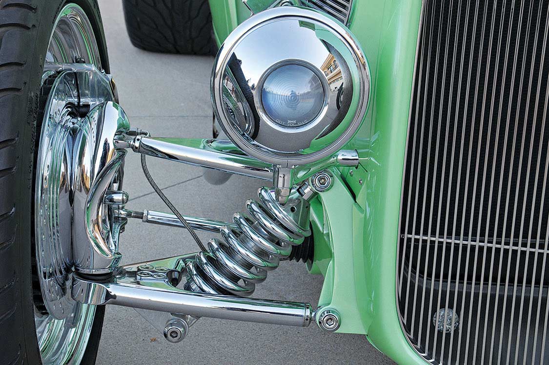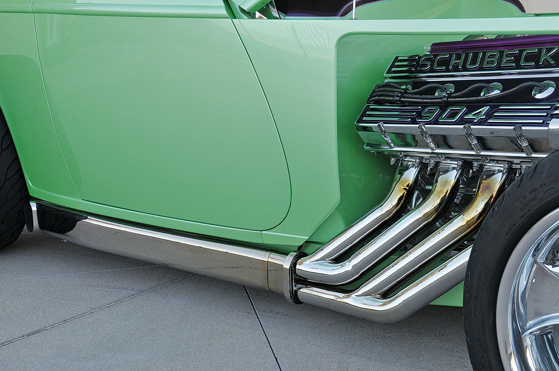 The differential, built by Currie, has a 3.58:1 ratio. A GearVendors overdrive allows for a final ratio of 2.7:1. The differential housing and axles were made by Mark Williams. The tube and reproduction 1932 box rail chassis, built at Boyd’s, has independent front suspension with Aldan shocks. The wheels are custom one-offs made by Evod Industries. Mickey Thompson tires cover the 18 x 8 wheels in the front and the 20 x 15 wheels in the rear.