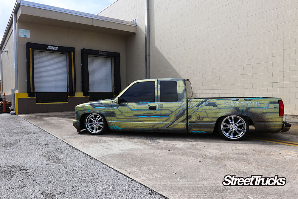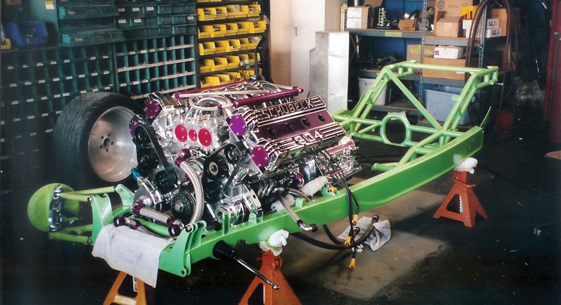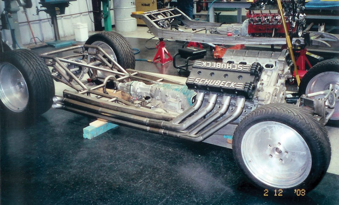 So, how about some more information on the engine that got the whole project started? The 904 cu. in. are derived from a 4.90-in. bore and a 6-in. stroke. The engine has dual overhead cams and 32 valves. At 3000 rpm, it puts out 1200 bhp and 900 lb.-ft. of torque. The custom port fuel injection was built by Schubeck and an Accel engine control module ignition system lights the fire. A dry-sump system was used for the oiling; the tank is in the trunk. Everything on the engine is polished, chromed or powder-coated. A GM 4L80E transmission from Jet Transmission sits behind the potent mill.