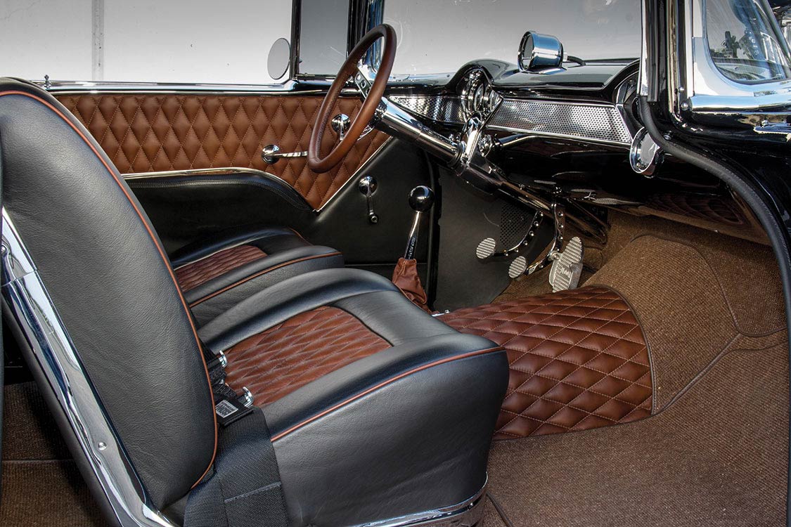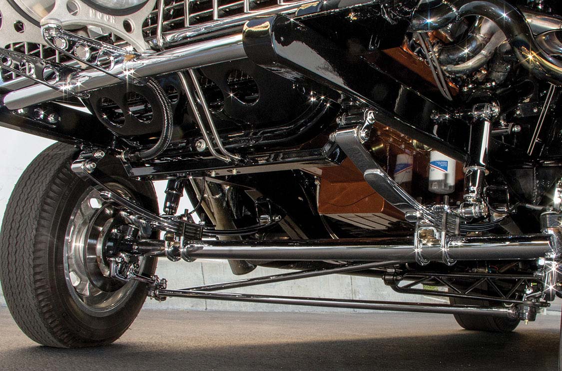 The interior and trunk were stitched and laid by Westminster Auto Upholstery in Anaheim, California. They used black leather with brown leather diamond tuck inserts and light brown short-pile carpet. A chromed single hoop roll bar with rear down bars was tied into the frame rails. A cool custom brake and clutch pedal assembly was mated with a nostalgic Moon Gasser-style throttle peddle. Reworked gauges fill the chrome gauge cluster, and the factory chromed steering wheel column is capped with a three-spoke tan leather steering wheel. To finish off the interior, the top of the dash was carved to nest the nostalgic Mooneyes chromed tachometer.