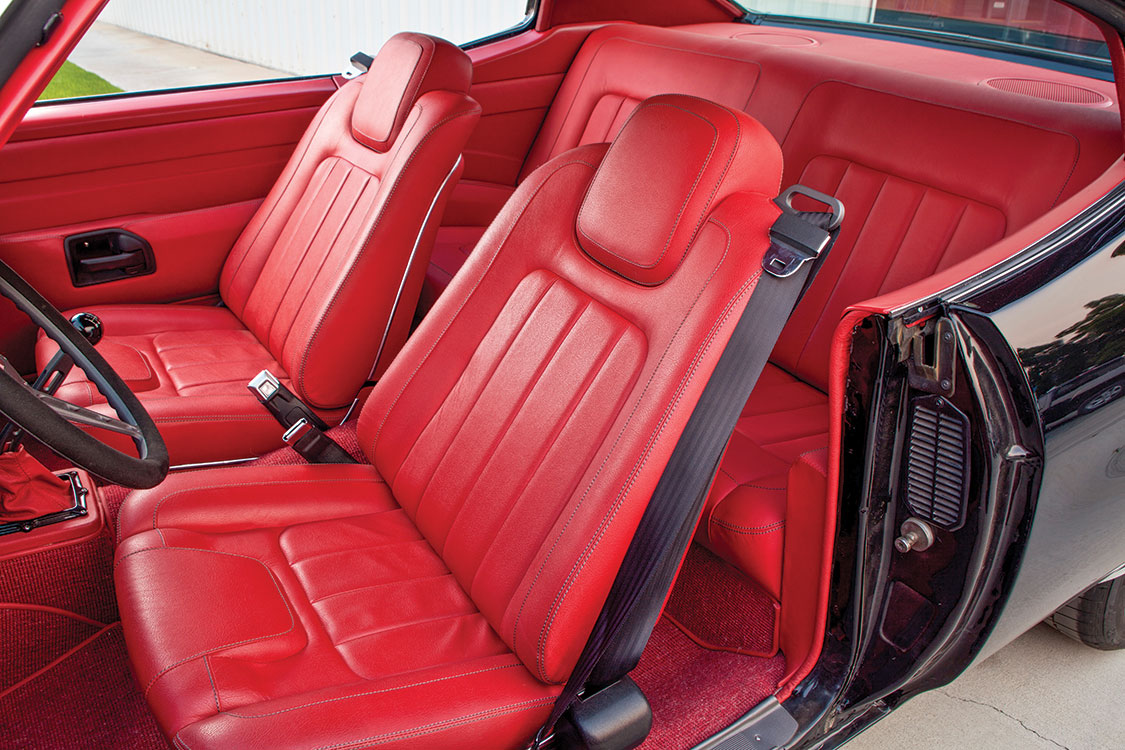 The inside is a different story. The entire dash bezel has been recreated as a custom billet aluminum piece featuring Auto Meter gauges and Ironworks switches. A Vintage Air system provides comfort on hot days and cold nights, a Budnik steering wheel and Marquez Design billet mirror finish things off for the interior styling. A Sony head unit leading to Kicker speakers provides the tunes. Lastly, Stitch by Stitch wrapped everything in red leather to set off the interior against the black exterior.