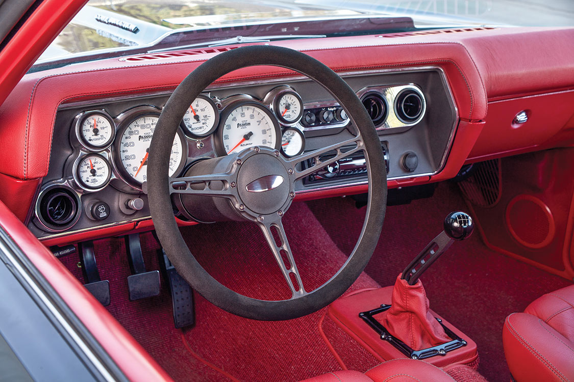 The guys at Ironworks started from the ground up, outfitting the car with one of their 1968-72 Chevelle chassis that adds rigidity and upgraded suspension for better handling. The front suspension consists of C6 Corvette components along with a Detroit Speed rack-and-pinion steering setup to an ididit column. A set of Ridetech triple adjustable shocks provides improved cornering and ride comfort as opposed to the old A-body suspension that could make even the most avid boater seasick. Fourteen-inch Wilwood brakes help bring things to a quick stop. Out back, a 4-link setup wraps around a Ford 9-inch rearend with 3.89 gears and a tough 35-spline Wave Trac differential. Ridetech shocks and Wilwood brakes round out the package. With improved handling and forthcoming added performance, race-inspired wheels were the way to go. A set of 19×10 and 20×12-inch grip-equipped Laguna wheels wrapped in Michelin PS2 295/30R19 and 335/30R20 tires provide a wide track pattern for keeping the muscle car under control.