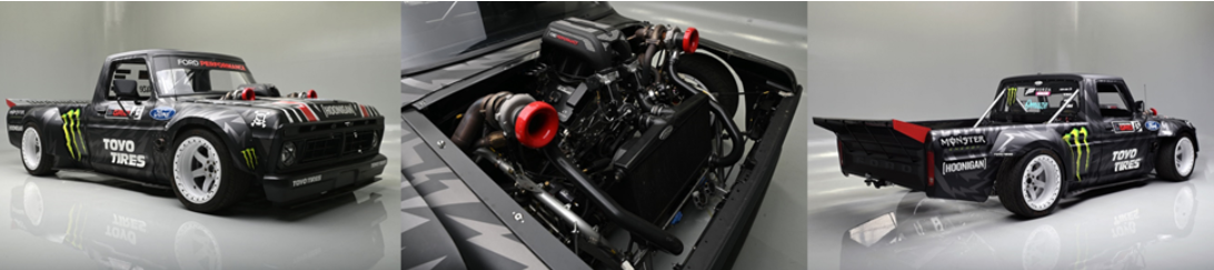 The “Hoonitruck” was built by Ken Block and the Hoonigan team in collaboration with Detroit Speed. It took two years to build from idea to reality for the viral Gymkhana drift video series. It is powered by a 914-horsepower twin-turbo 3.5-liter EcoBoost V6 engine that puts power to the ground through a custom all-wheel-drive system. It includes a bespoke, 3D-printed intake manifold designed by Ford Performance, visible through the hood and flanked by two turbochargers.