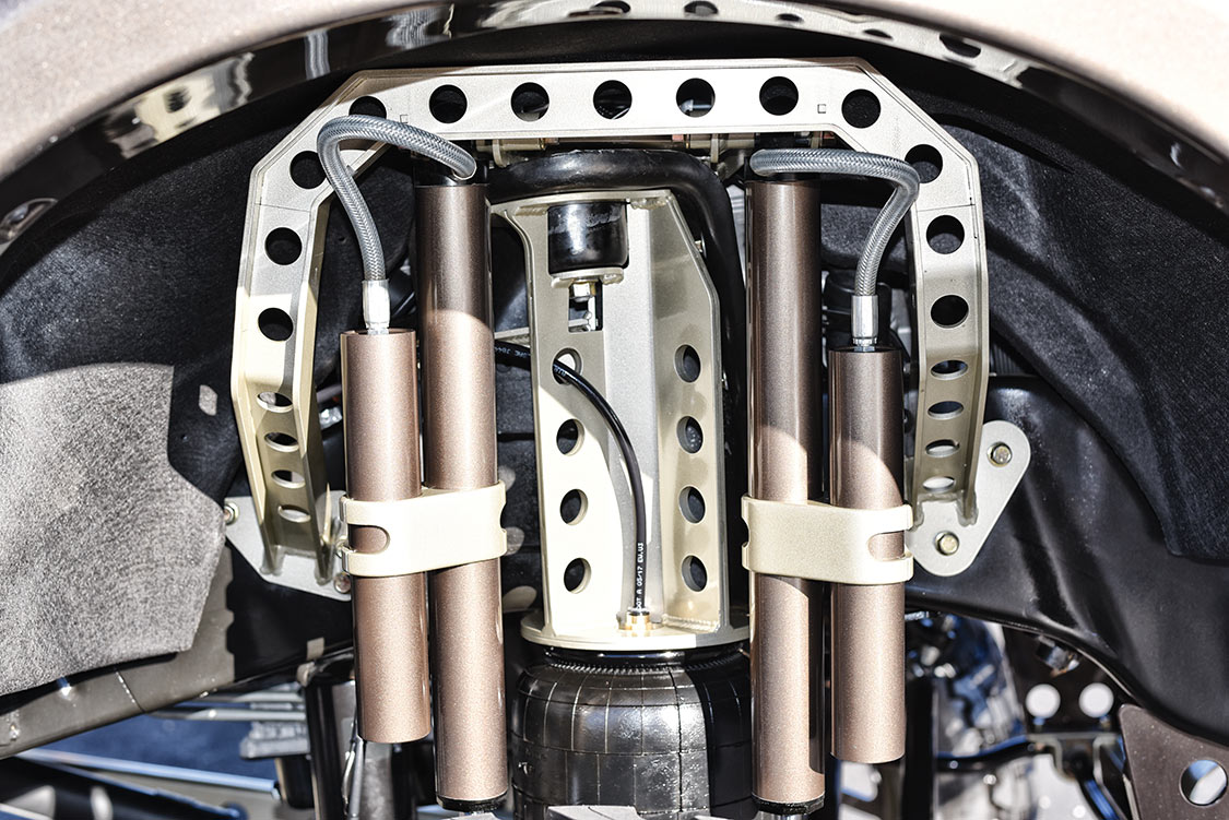 Michael decided on shocks from First Over All Off Road Shocks (F-O-A), which is the shock recommended by UAR. The 2.0-inch remote reservoir shocks are custom valved for use with UAR air suspensions, with 12 inches of travel in the front and 16 inches of travel in the rear. Michael chose to pair the kit with an Air Lift Performance on-board air system.