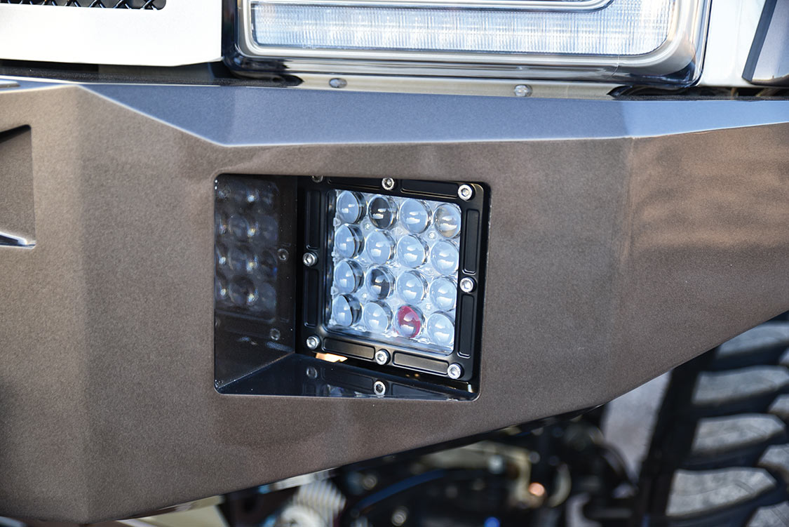 Visually, the King Ranch has had quite a few modifications to make it stand out from the crowd. Starting with the F-250’s beefy body lines, Michael decided on an Overkill Fabrications grille shell, which was installed along with Fusion front and rear bumpers. Bushwacker fender flares were chosen for the front and rear of the truck, while the door handles and mirrors were painted to match the color of the truck’s body. All paint work was done by James Anderson in Brandon, Fla., who also painted all of the chrome and the tailgate plate to match the body color.