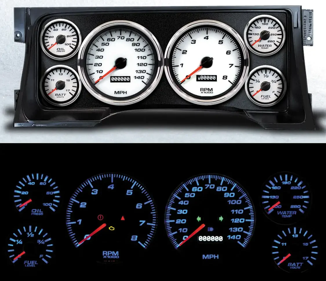 Upgrade your 1988-’94 Chevy or GMC truck with the complete package from Classic Dash, designed to enhance your dashboard with modern functionality and style. It includes: gauge wiring harness, oil pressure and water temperature sending units, turn signal, high beam, and parking brake indicator (LED) kit, 3-⅜-inch speedometer, 3-⅜-inch tachometer, 2-1/16-inch fuel level gauge, 2-1/16-inch oil pressure gauge, 2-1/16-inch water temperature gauge, and 2-1/16-inch volt gauge.