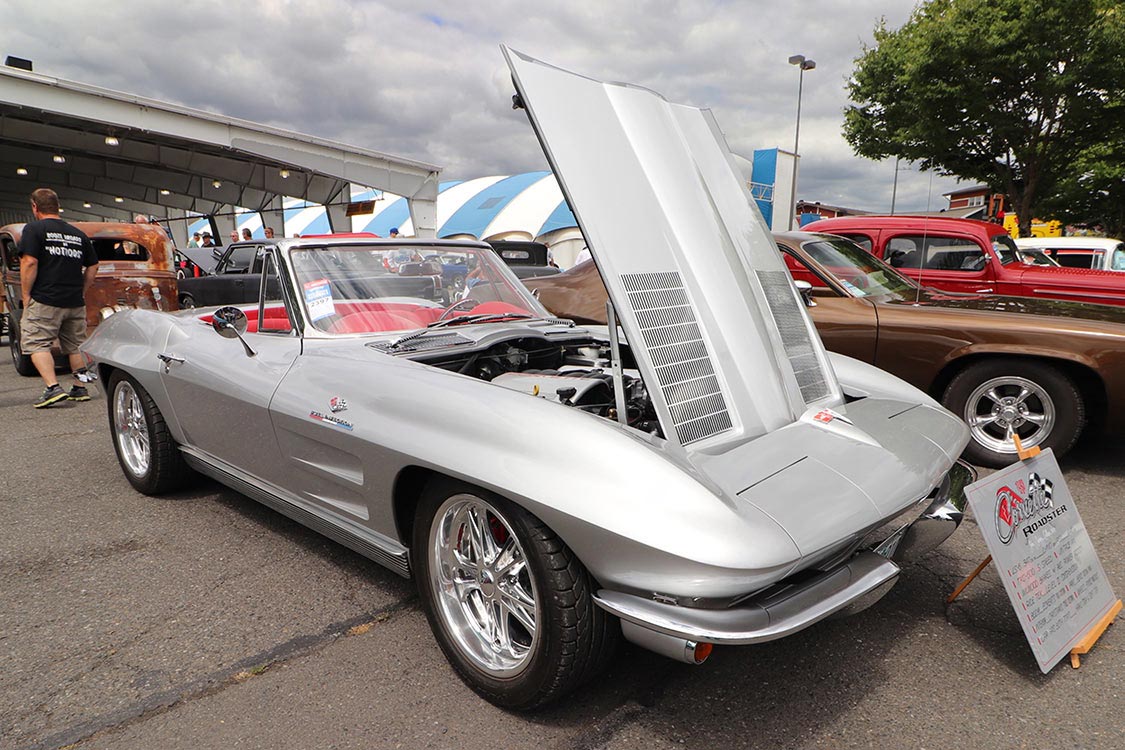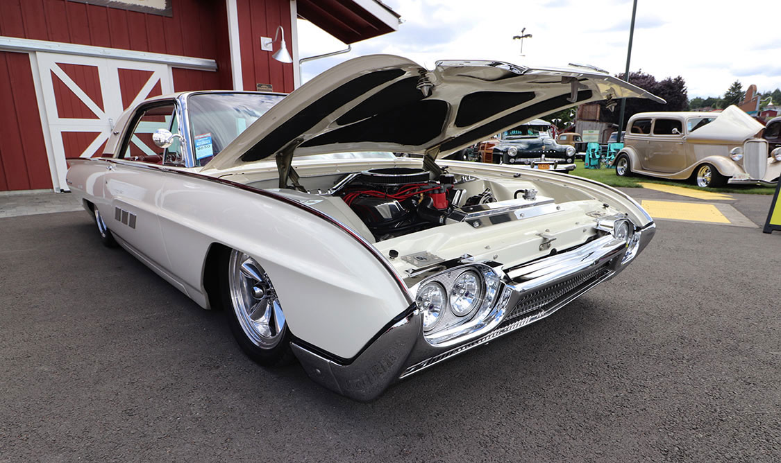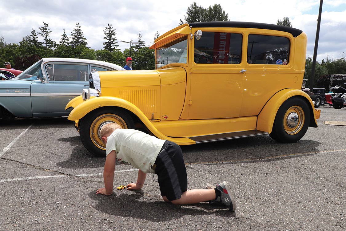 Post Falls, Idaho’s Jim Hummel’s home built ’29 350/350 Ford Sedan no doubt matched the yellow hue of the youngster’s toy in the foreground.A ‘rare bird’, this ’63 T-Bird belongs to Tacoma, Washington’s Bob Collier.The 418 CI engine and C-6 transmission in Collier’s T-Bird makes for a fun ride.Langley, BC’s Pete Wostowicz’s ’56 Ford Convertible is 312 Y block powered.John & Suzanne Callison’s ’63 Corvette Roadster has a 440 HP, 347 CI LS-6 mated to a TKO-600 5-speed, Ride Level II suspension, Ben’s Custom Paint and Christian’s Street Customs interior.