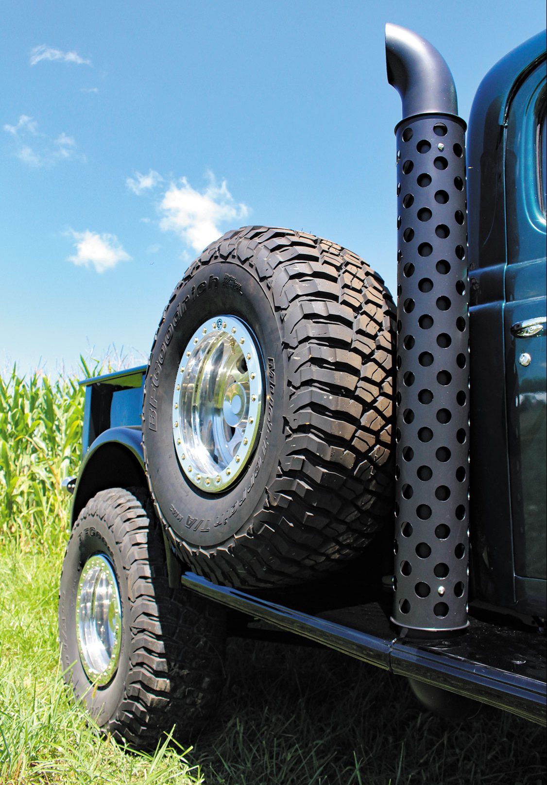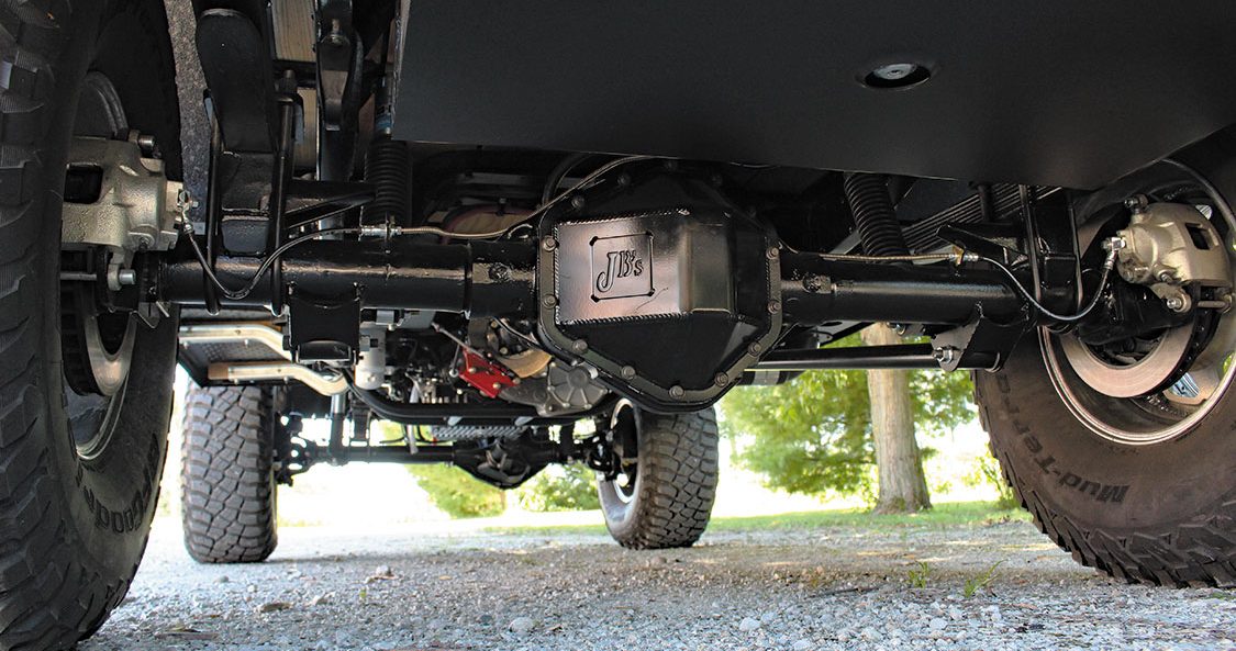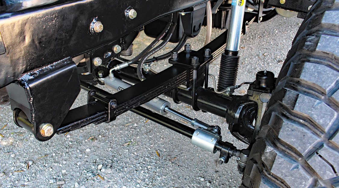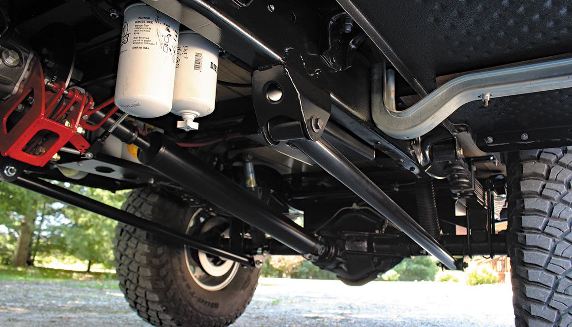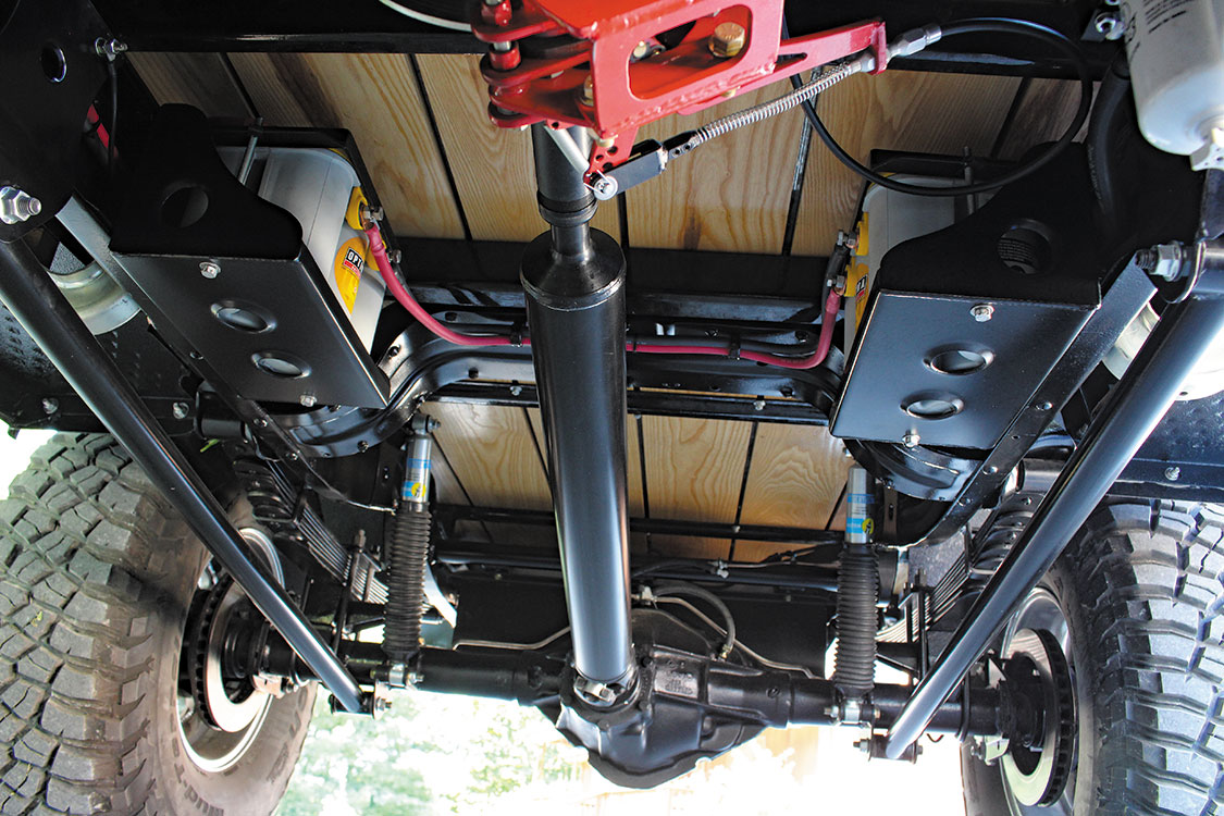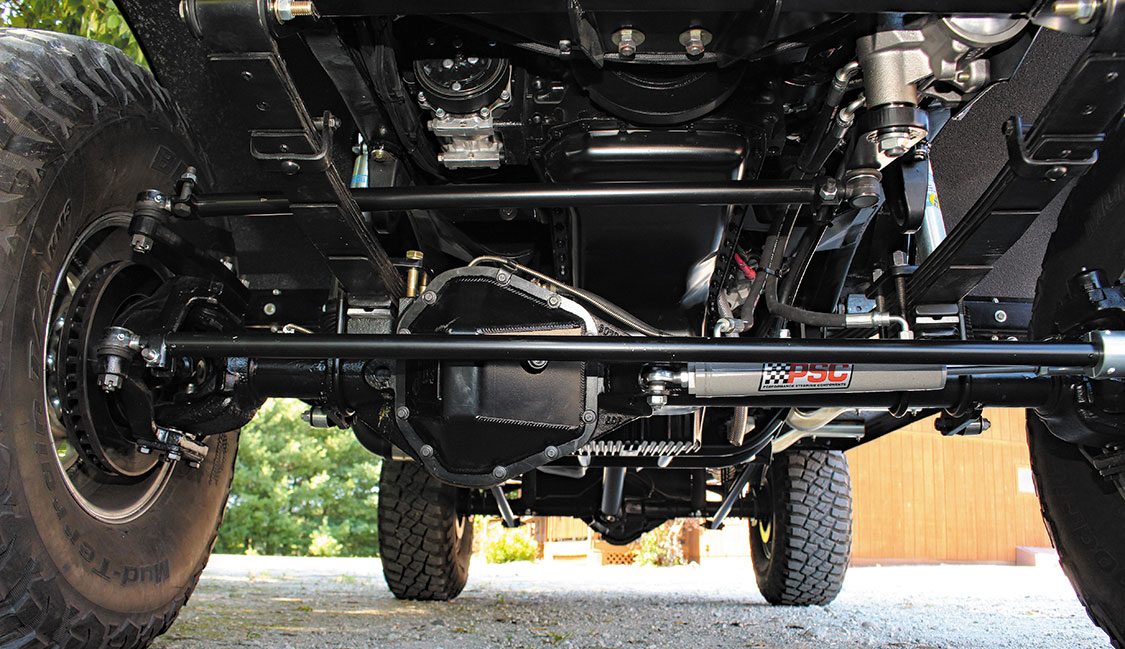 Axle selection boiled down to the tried and true Dana 60 up front and a GM 14-bolt in the rear. Both make use of a 3.73 ring and pinion, but the 14-bolt was treated to a Detroit Truetrac differential, with its axle tubes serving as mounting points for the traction bars that link the axle to the frame. The Dana 60 sits below first-gen intended leaf springs and features a host of steering upgrades. The steering box was relocated and fitted with a high steer arm, a custom pitman arm and PSC cylinder-assist components were added, and a heavy-duty tie rod assembly also made the cut.