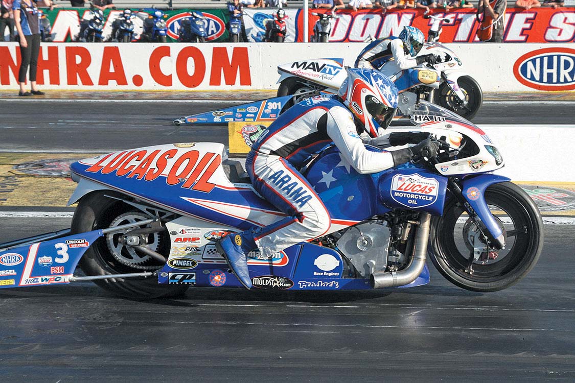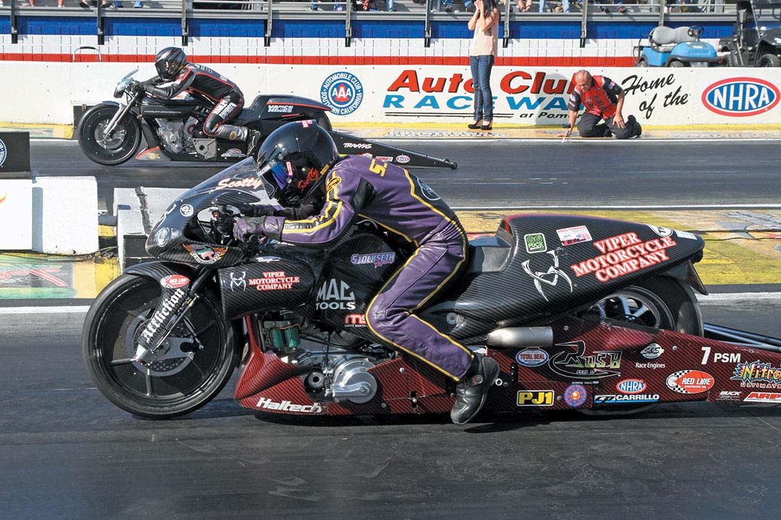 Pro Stock Motorcycle: Eddie Krawiec (far lane), 6.918 at 198 mph, beat Scotty Pollacheck’s (near lane) 6.963 at 193.57 mph.