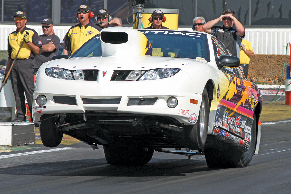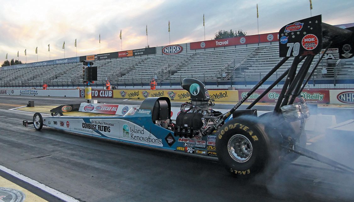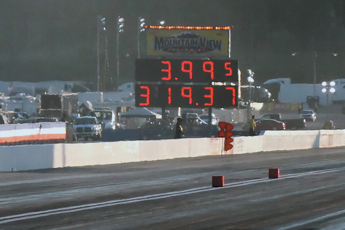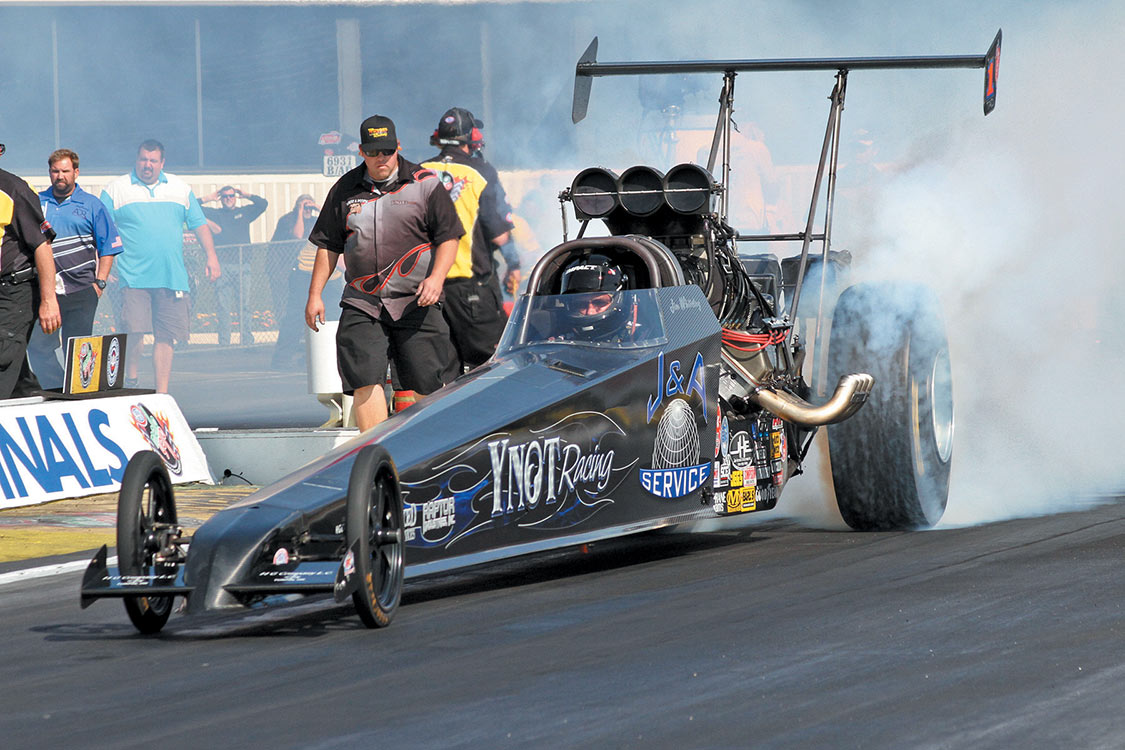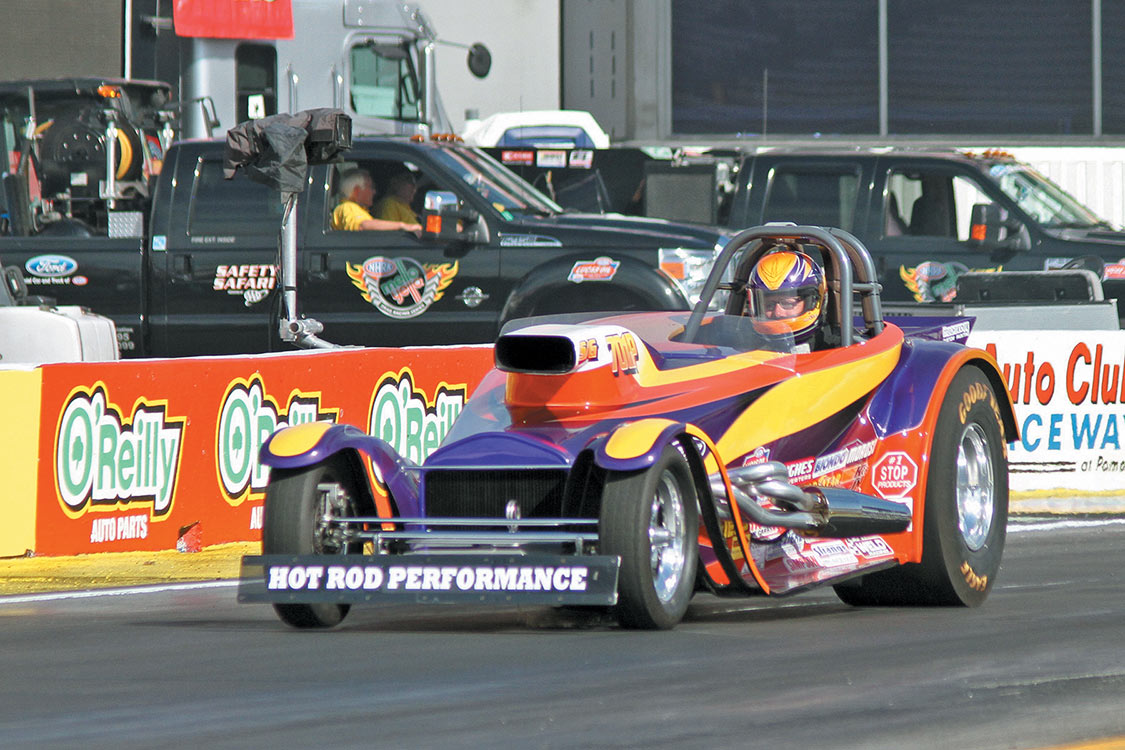 Super Comp: Bobby Dye Jr. (dragster), 8.915 E.T., defeated Andrew Madrid’s (pictured) dragster at 8.938 E.T.Super Gas: Pete Zak ’27 Ford, 9.881 E.T., defeated Dave Kelly’s (Firebird) at 9.877 E.T.