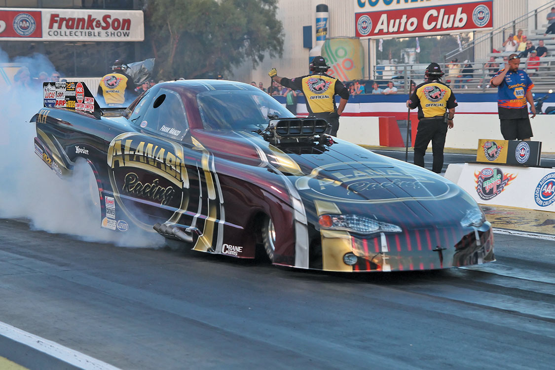 Top Alcohol Dragster: Johnny Athen (blue and white), 5.428 at 259.86 mph, beat Jim Whiteley’s 8.590 at 95.5 mph.Top Alcohol Funny Car: Frank Manzo (shown) ,5.531 at 265.06 mph, defeated Clint Thompson’s 6.758 at 161.59 mph.Comp Eliminator: Jeff Lane (gold car), 9.863 at 95.90 mph, beat Doug Lambeck who fouled.