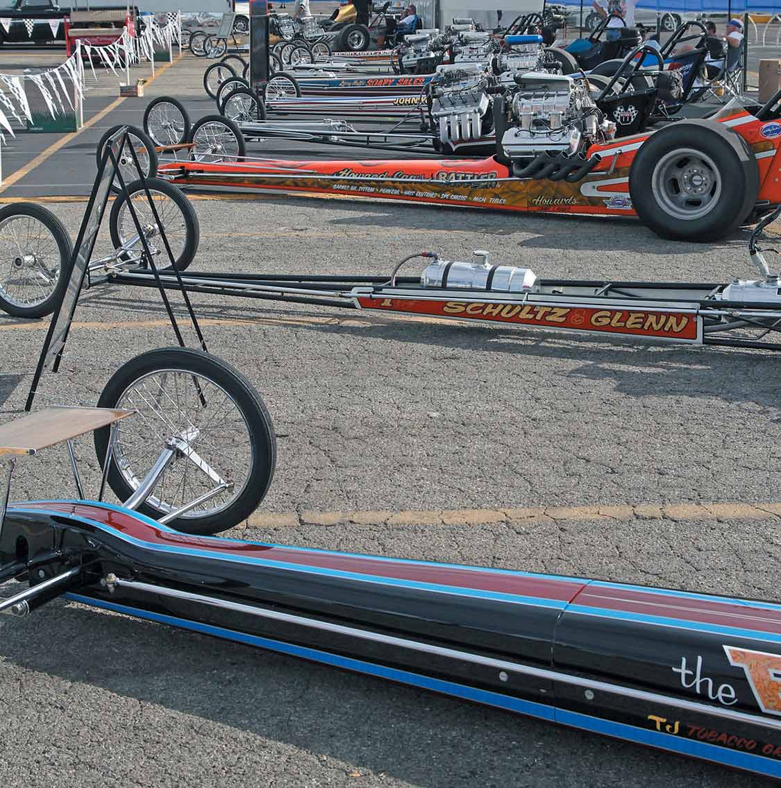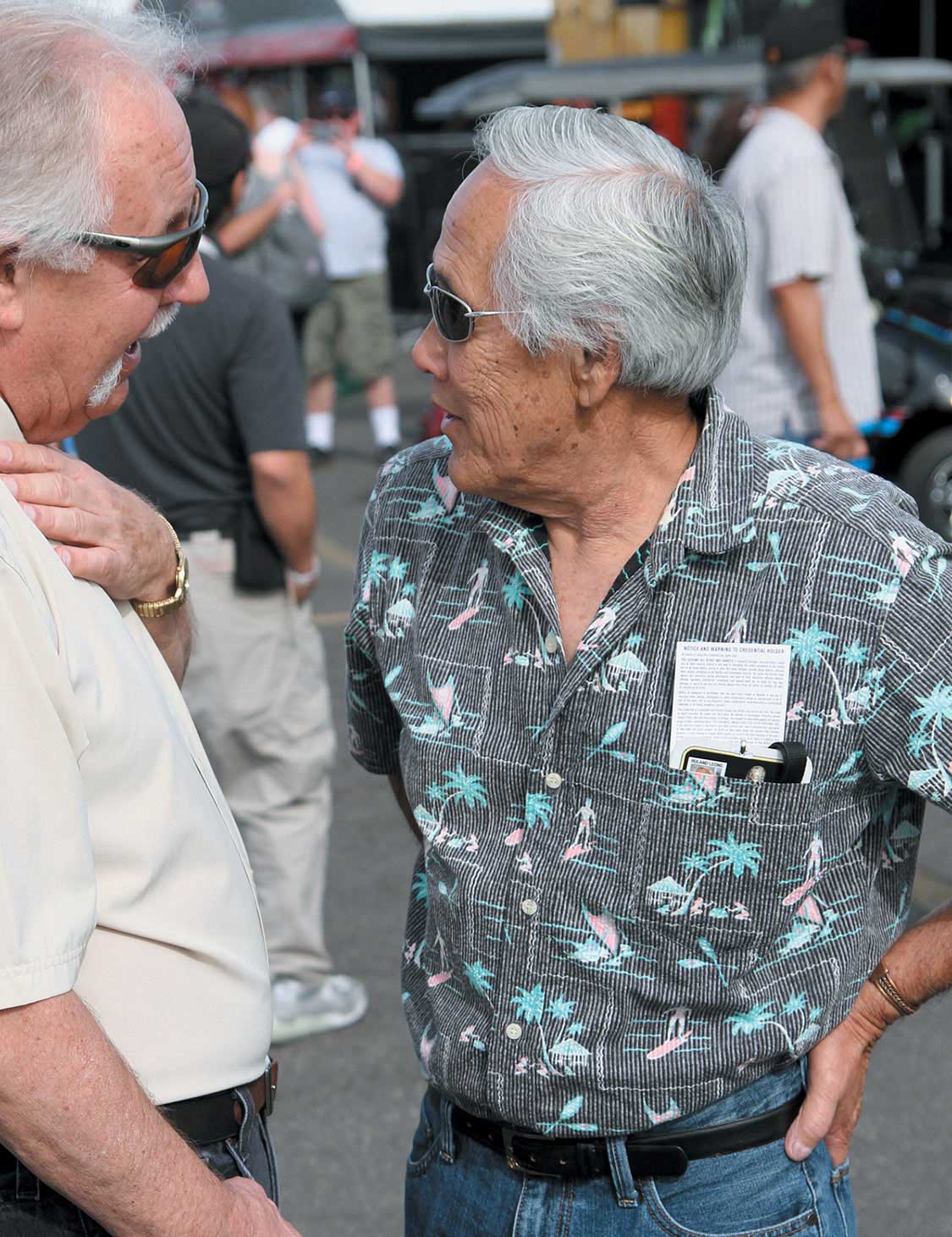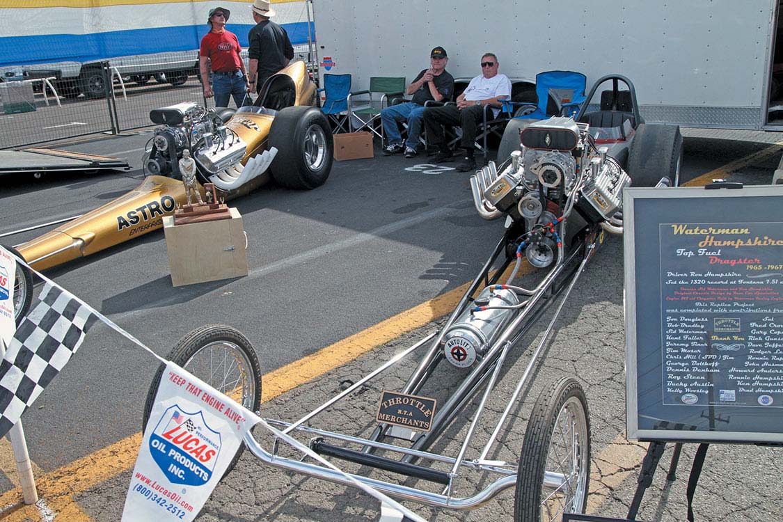 Legends Tom McEwen and Don Prudhomme were the co-grand marshals of the event.Drag racing legend Roland Leong (R) talks with a fan.Lots of nostalgia race cars, including these Top Fuelers, were displayed in the Cackle Corral.