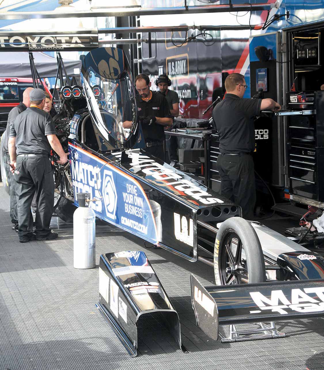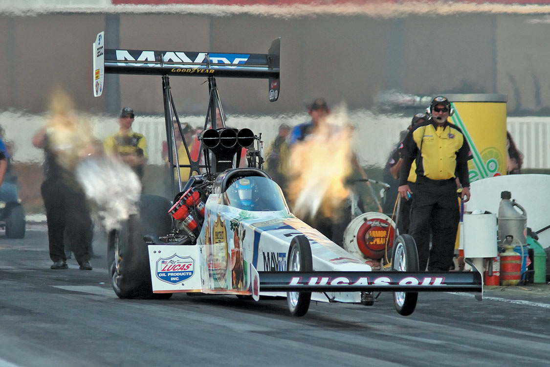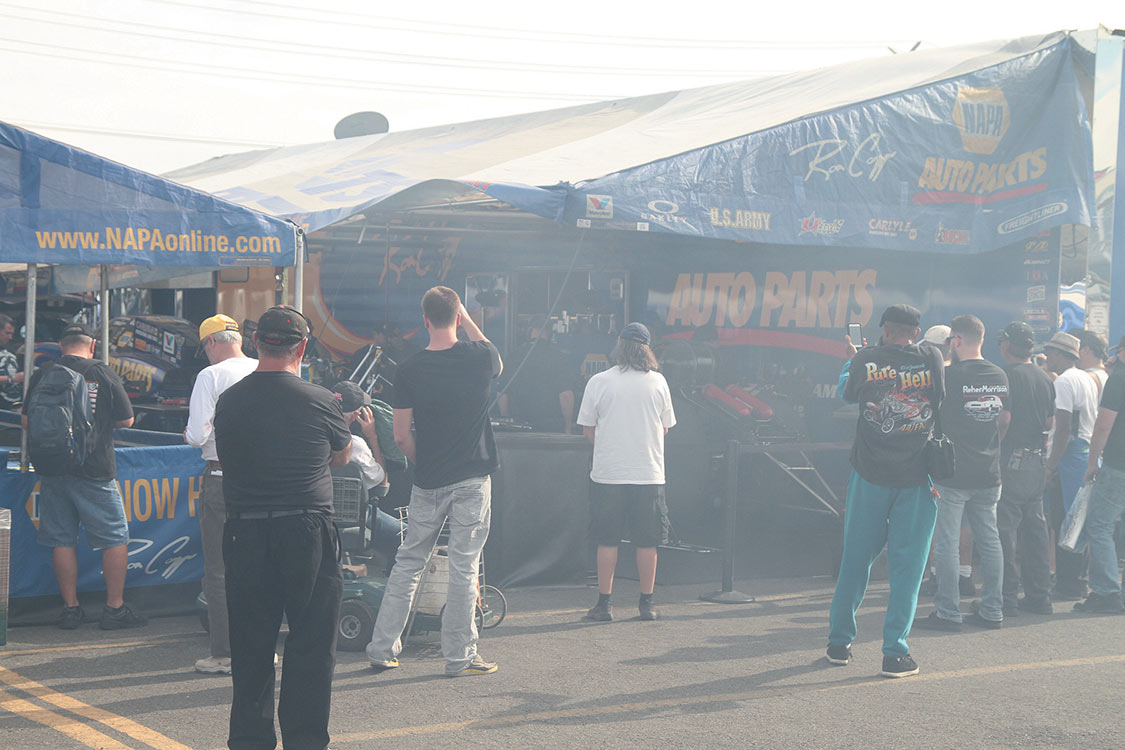 Stock Eliminator: Bo Butner (black car), 9.951 E.T., defeated Peter Biondo’s 10.393 E.T.Smoke on the track and in the sky. Megan McKernan does a burnout at sunset in her Top Alcohol Dragster.Shawn Langdon’s dragster gets ready in his pit.Antron Brown’s pit readies his dragster.When the nitro dragsters warm up, people like to breathe deeply of the dragster exhaust.
