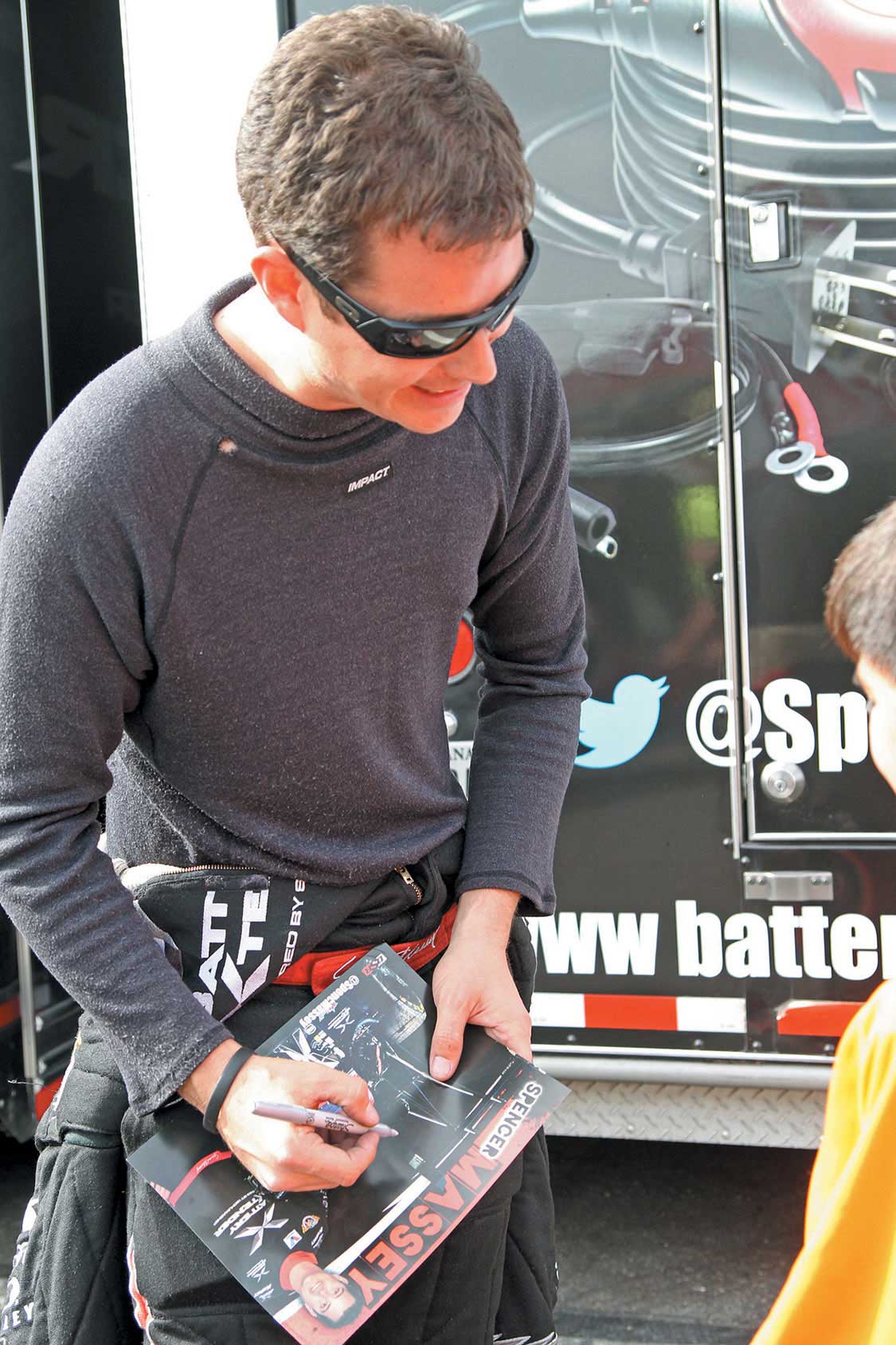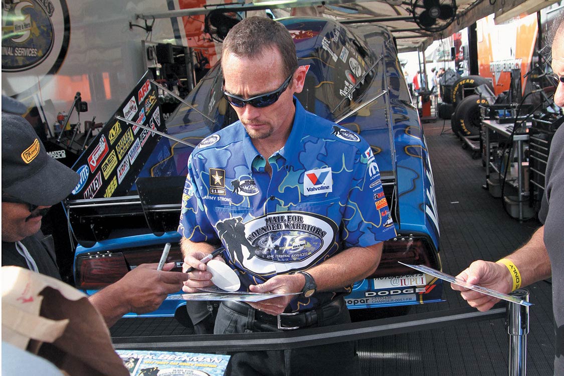 Spencer Massey autographs stuff for fans.Top Fuel Funny Car driver Jack Beckman signs autographs.