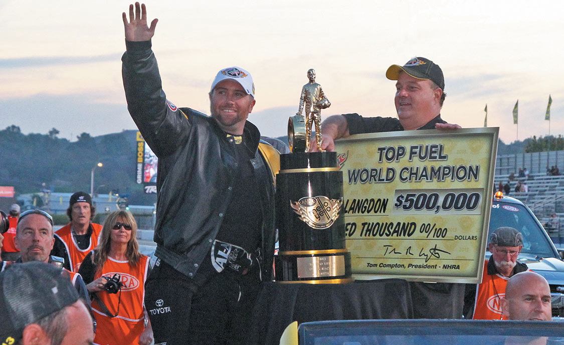 After qualifying #1, Shawn Langdon took home the trophy and then some! Note: Since the NHRA 2009 season, Top Fuel Dragsters and Funny Cars have run on a 1,000-foot track, not a quarter-mile track. Winners and record holders in those classes are champions at the latter distance. Quarter-mile elapsed time and speed records can only be challenged on a quarter-mile track. Shawn Langdon, Brandon Bernstein, Cruz Pedregon, Antron Brown, Jack Beckman, Del Worsham, Matt Hagan, Larry Dixon, John Force, Tony Schumacher and Robert Hight are the only NHRA Drag Racing Series Champions at the 1,000-foot distance.