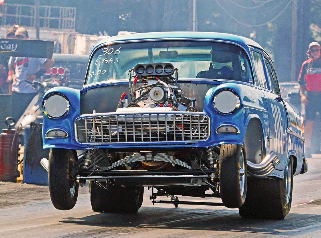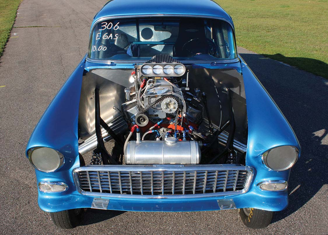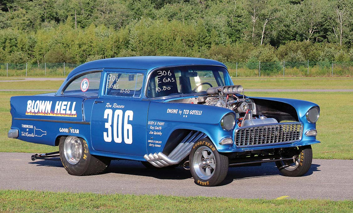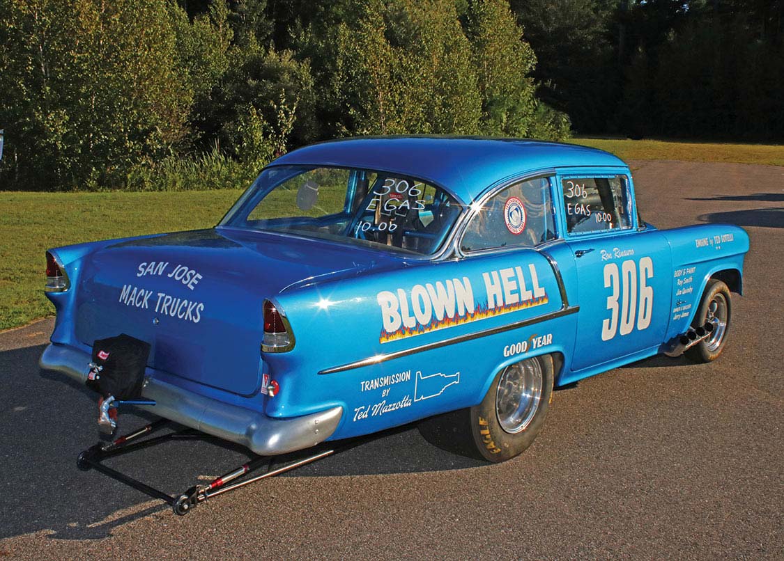 For those who love the nostalgia era of drag racing, Ron Rinauro’s California-based ’55 Chevy 210 Club coupe can be found in the yellowed, dog-eared pages of a well-known magazine dating back to 1966. Aptly named Blown Hell, this altered-wheelbase shoebox Chevy was a regular at tracks like Fremont and Half Moon Bay many years ago. Back then, the car ran a 292-cid small-block with a GMC 6-71 blower, Hilborn fuel injection and a Vertex magneto on 10% nitro. Using a TorqueFlite transmission, the best numbers for Rinauro’s combination was a very respectable 9.73 at 146 mph.