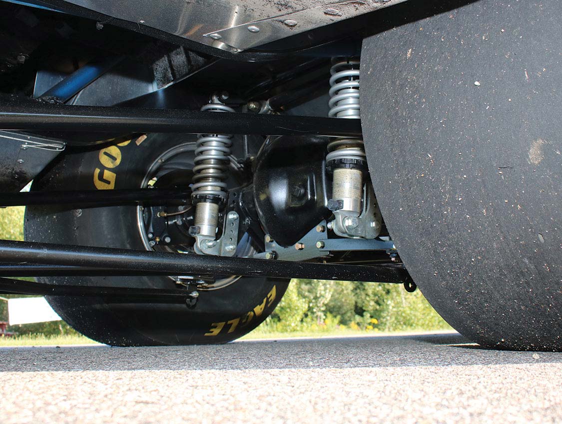 James hand built the chassis using an S&W Race Cars mild steel back-half kit grafted to the original frame. The rear axle, which was moved up 20 inches, was the anchor point for a Dana 60 differential with Strange spool/axles, Richmond 4.56:1 gears and Wilwood brakes.