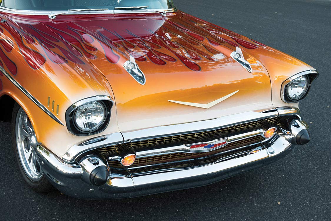 Enter Mike McDowell and Mike Parsons from Orange County, California. McDowell was a former Mt. Clemens resident and at one time part of the Grand Avenue builders’ society. He closely followed the build of Rider’s ’57. McDowell put a bug into Rider’s ear that the car needed to be seen and offered to pay the price for the privilege. It took a fair amount of time, but Rider, interested in other projects and fighting some health issues, agreed that the coupe he and the guys had slaved over needed to be in its true element, and no place is that element more intense than Southern California. The deal was done and the flamed ’57 headed west.