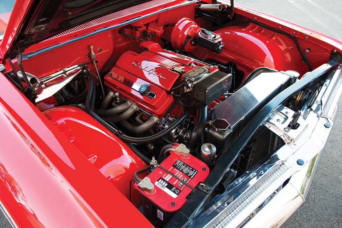 The car became known as Red Phin by the circle of professionals who applied their talents to the unique street machine. As it neared completion (as least for the time being) the new Foose wheels were matched with Pirelli P-Zero tires, 255/35-20 front and 275/55-20 rear. When the aluminum and rubber were bolted on, it was time to stand back and say “ah.” Or in this case it was more like “awe.”
