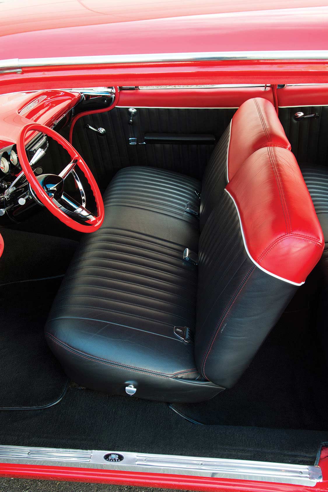 Now that the Chevy was road worthy, Lev turned his attention to the interior design and audio components. Foose designed the interior using many original GM elements. At this point, Lev called in another industry contact, Mitch Katz of Katzkin Leather. Although Katzkin is the premiere supplier of aftermarket leather interiors, they rarely take on one-off projects. But, this was different and Katz wanted to be a part of it. The black and red leather was designed and stitched to have ties to the original Chevy showroom two-tone style with a more modern flair. Door panels were created with black leather pleats with oversized white piping. The dash was color matched and fitted with Auto Meter gauges, white face on the vitals and classic white-on-black Pro Comp for the speedometer. The final touch was an ididit column with billet gear selector, tilt and signal stems.