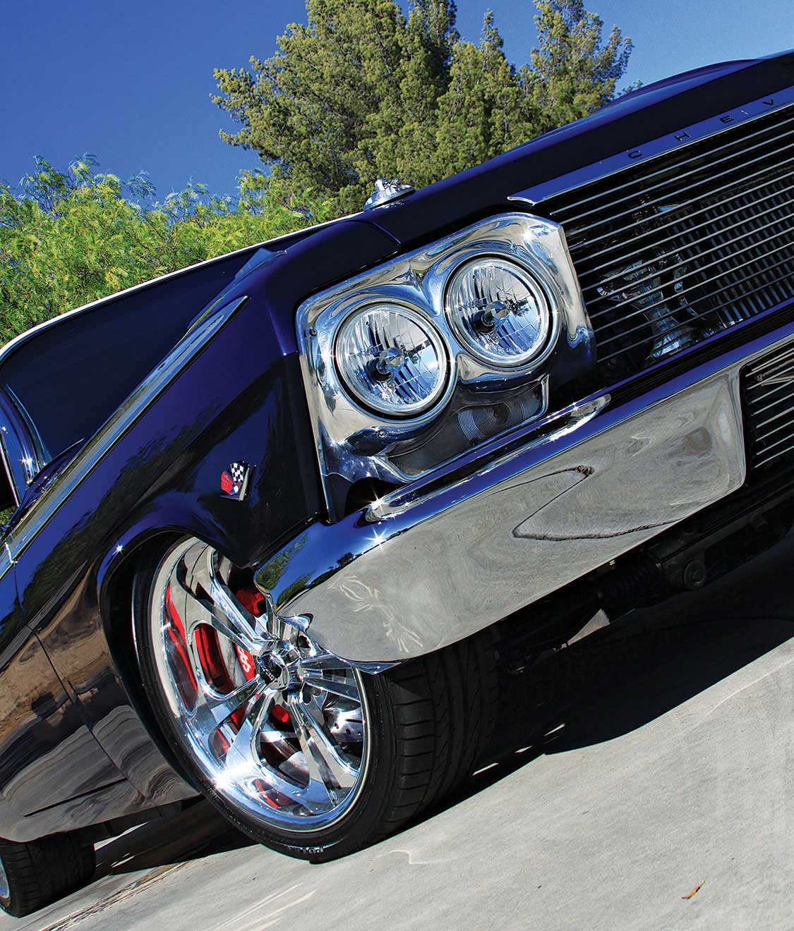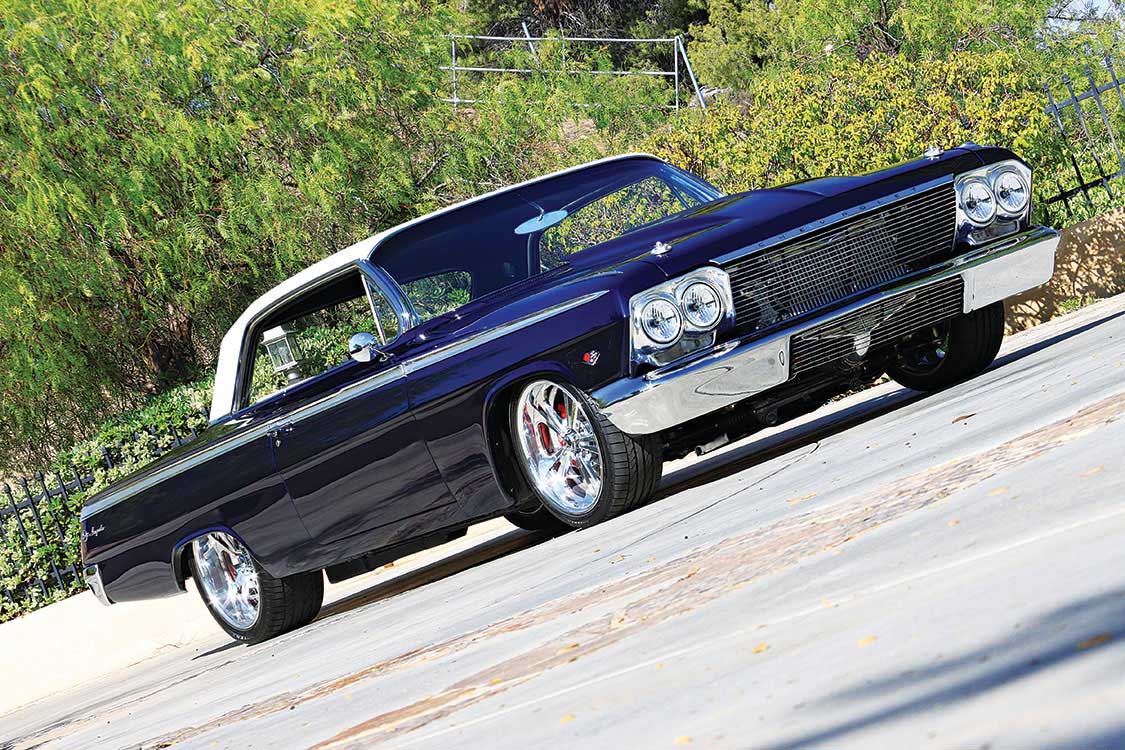 The wheels make the ride: Raceline Jaded 5 wheels all around in 18 x 8 inches front and 20 x 12 inches aft, wrapped in Bridgestone Potenza Run Flat skins in 245/35/18 front and 315/35/20 rear. Rolling stock is surely about good looks, but it’s also about real function. These steamroller treads hold the road like super glue because there’s so much contact patch. They handle; they hold the road; and they hook up with real aggressiveness when Bobby stabs the throttle and the twin turbos begin to hiss and whistle. When torque tips its hat, the 355-ci Chevy Donovan makes positive G-forces unseen by those vintage 409 fat-blocks. But make no mistake, Bobby’s 355 got its inspiration from the legendary 409. It wasn’t only going to keep up with the 409; it was going to beat it.Head on, Bobby’s Impala hints at what’s on the other side of the radiator. This is the intercooler, which works hand in hand with a pair of Precision 67mm turbochargers. Bobby admits he considered GM’s LSX engine until he fell into a Donovan Chevy block, which works well for just about anyone. He could have stroked this Donovan mill in excess of 400 ci but didn’t see the need. With intercooled turbocharging and a wealth of power on tap, 400-plus inches would have been more than he needed. Bobby learned early on that bigger isn’t always better. Keeping displacement well within the limits of a 350 Donovan block taught him plenty about power. It’s all in what you do with the power you have that counts, not necessarily how much power you have.