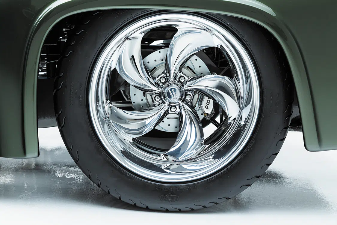 Once he had an idea of what he wanted, Gilbert called on Vern Heidt to assist. A TCI chassis was equipped with RideTech Shockwave airbag-over-shock units on all corners of the suspension, providing a compact solution to fitting the air ride. The wheels are wild and wide American Racing VF489 rollers, measuring 18×8 at the front and 20×15 at the rear, with equally impressive 28×10.00R18LT and 31×18.00R20LT Mickey Thompson Sportsman S/R rubber.