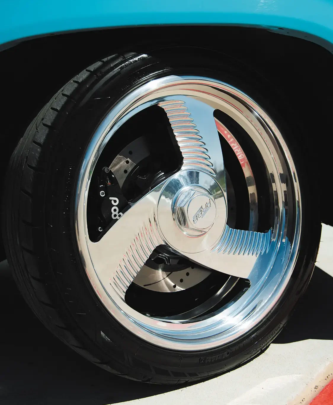 Once home, Greg dug into the truck’s history. He found the original Belltech lowering kit from ’91 still in place. With some help from Mark Oja and Sarah Duran at Belltech, he confirmed its authenticity. The paint, a fleet blue with a silver leaf pinstripe, was still original, giving Greg a solid foundation to work with. Although the original 15-inch Boyd Tri Fans were swapped for 20-inch Torque Thrusts by the second owner, Greg had to bring back the Tri-Fans, but in a 20-inch size, to fit Little Shop’s big brake kits.