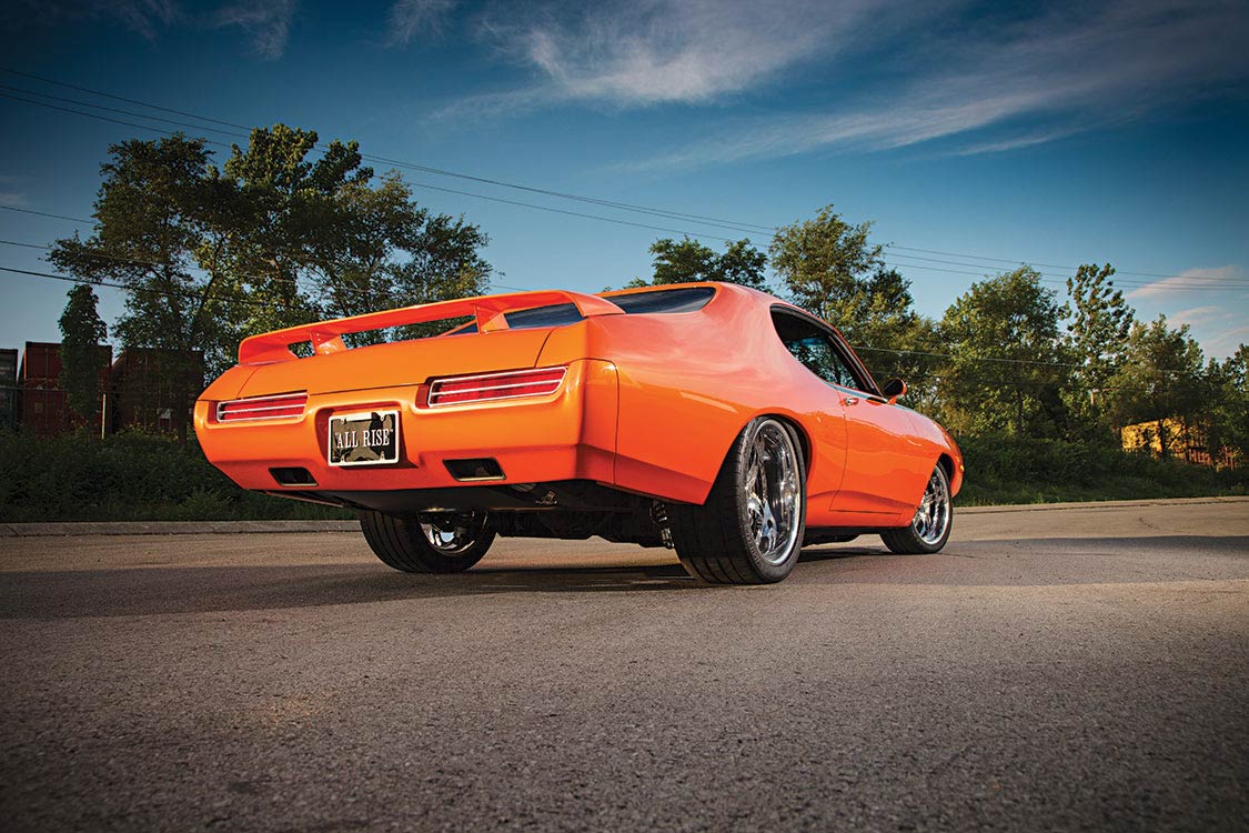 The plan was to execute a number of subtle changes to the classic Pontiac A-body design. These included flush-mounted glass and a slight change to the arch of the rear window. More radical modifications included reforming the tail section. The massive factory chrome bumper was cut into multiple pieces, reassembled, then stripped, primed and painted. It was blended with a section that integrates into the bodyline as it dives toward the ground. The taillights were also custom crafted to better contour into the overall shape of the car. The signature rear deck wing remains to keep the look familiar, yet different.