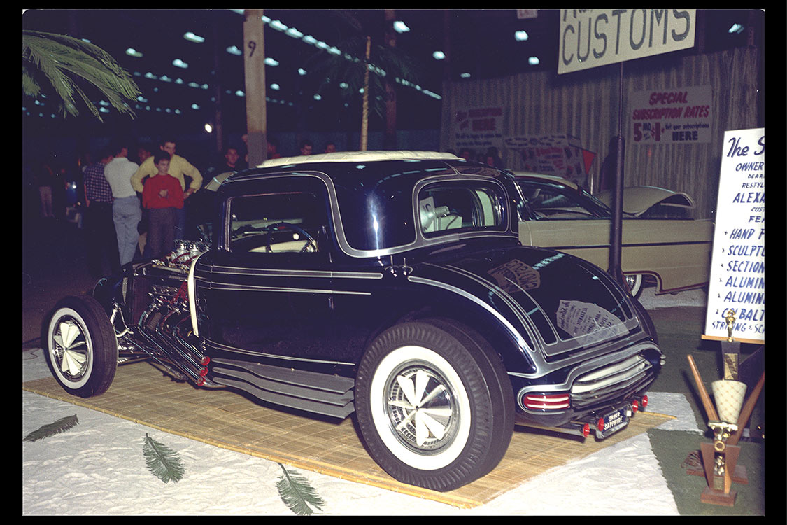 The Alexander Brothers installed their trademark twin Frenched antennas, which ingeniously doubled as the electric door-solenoid switches. Big slicks, wild blue metallic paint and, of course, the beaucoup chrome were all popular period modifications. At the 1959 Detroit Autorama, Chili’s coupe had the extreme visual impact that all the big show entrants sought. This car’s combination of modern (for the time) mods on a traditional shape was well executed and everything worked together. Catallo’s coupe was a star.