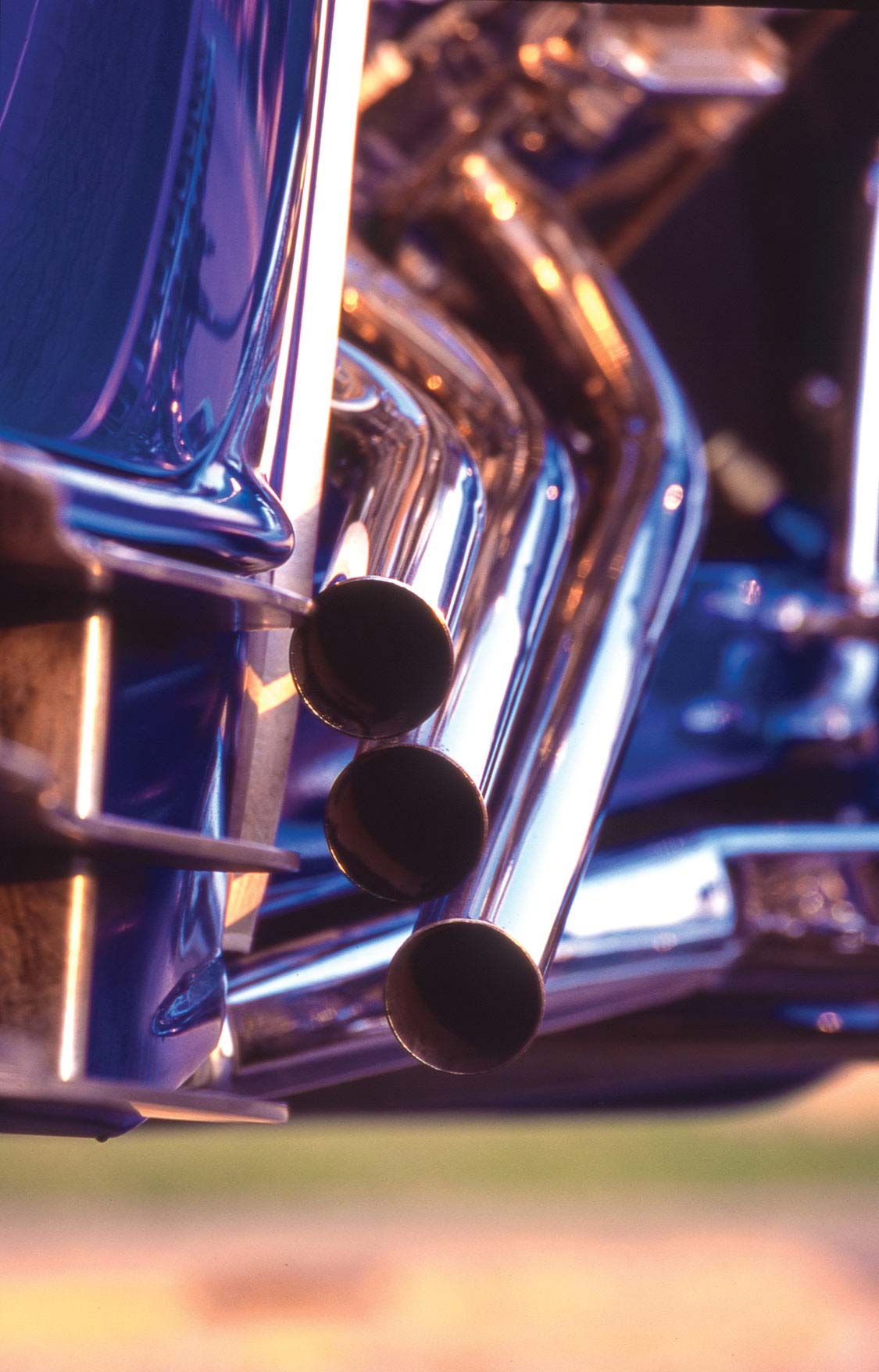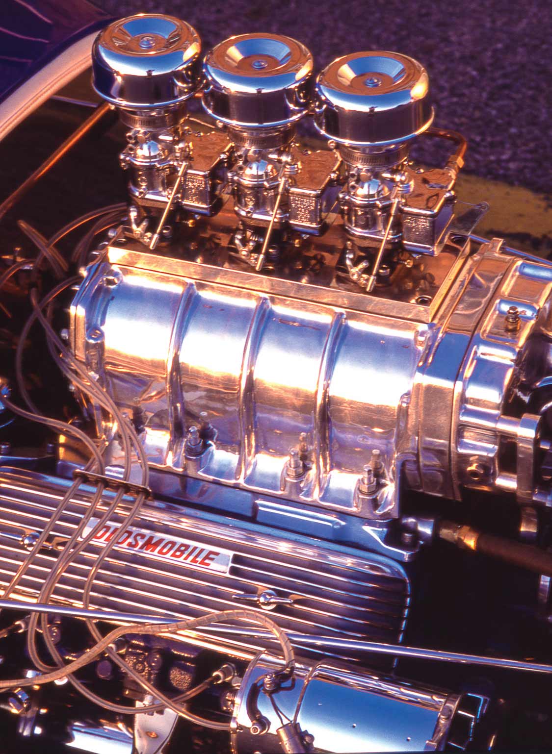 Echoing its drag-racing days, the polished engine received a hot Clay Smith camshaft, Chrysler intake and GMC truck exhaust valves, and Jahns blower pistons. But the pièce de résistance was a new GMC 6-71 blower topped with three Strombergs. The firewall was polished, so from the right angle, the engine looked even bigger than it was. Also, nearly everything up front was chromed including the 1937 Ford tubular front axle, Monroe shocks, leaf spring, split wishbones and Kinmont brakes.