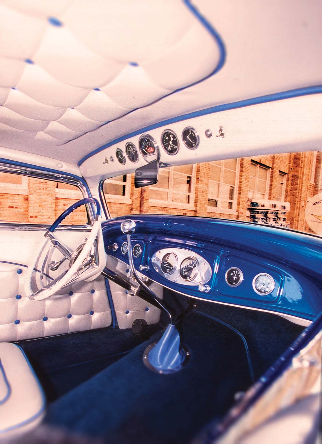 Larsen Upholstery trimmed the tufted white Naugahyde interior with blue accents, and for seating, twin bucket seatbacks joined two seat-cushion pads attached directly to the floor. Additional gauges and switches were added to the ceiling, and the steering wheel was a big, dished unit from a 1959 Lincoln Continental.