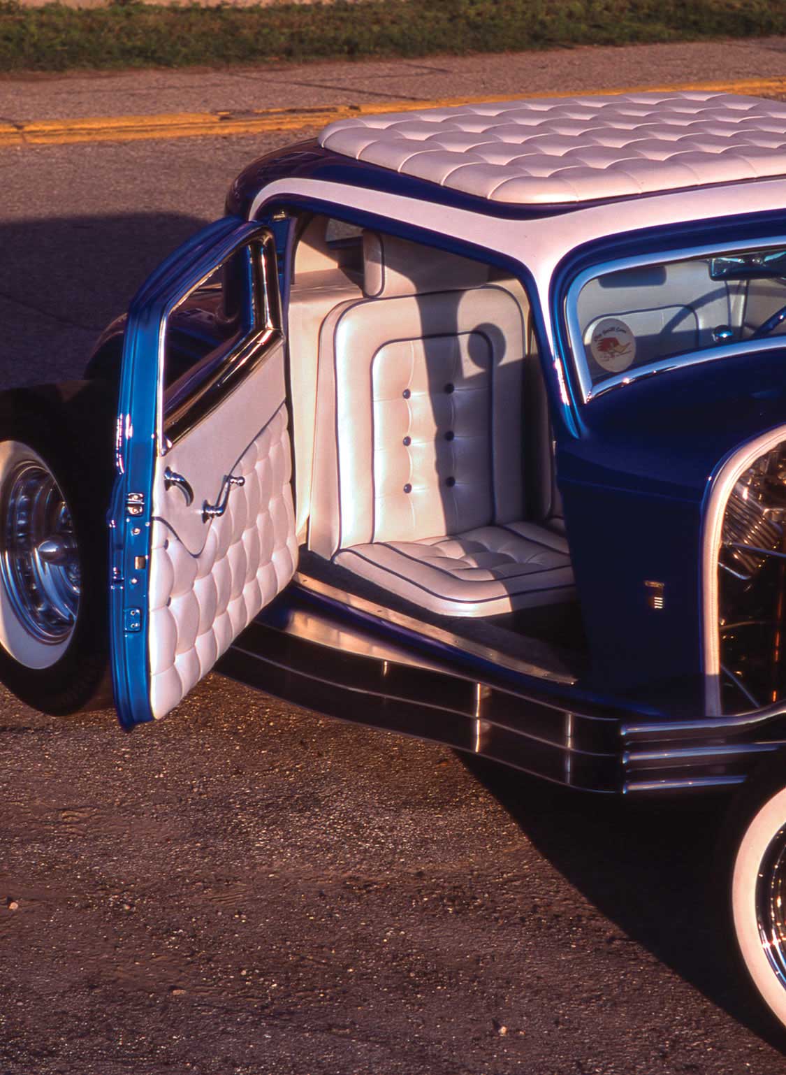 That was all cool, but Chili was just getting started. Now done with high school, he convinced his parents that he should attend college in California. After leaving Detroit and towing his coupe west for classes at Long Beach Community College in California, he soon exchanged his labor as a shop helper at Barris Kustom, in nearby Lynwood, for a 3-in. top chop. Here Chili worked with Herschel “Junior” Conway, who was also responsible for a new Pearl and translucent Oriental Blue finish, applied just before the car graced Hot Rod’s famous cover. The car’s rooftop now rode 15 in. lower than a stocker, with virtually perfect proportions.