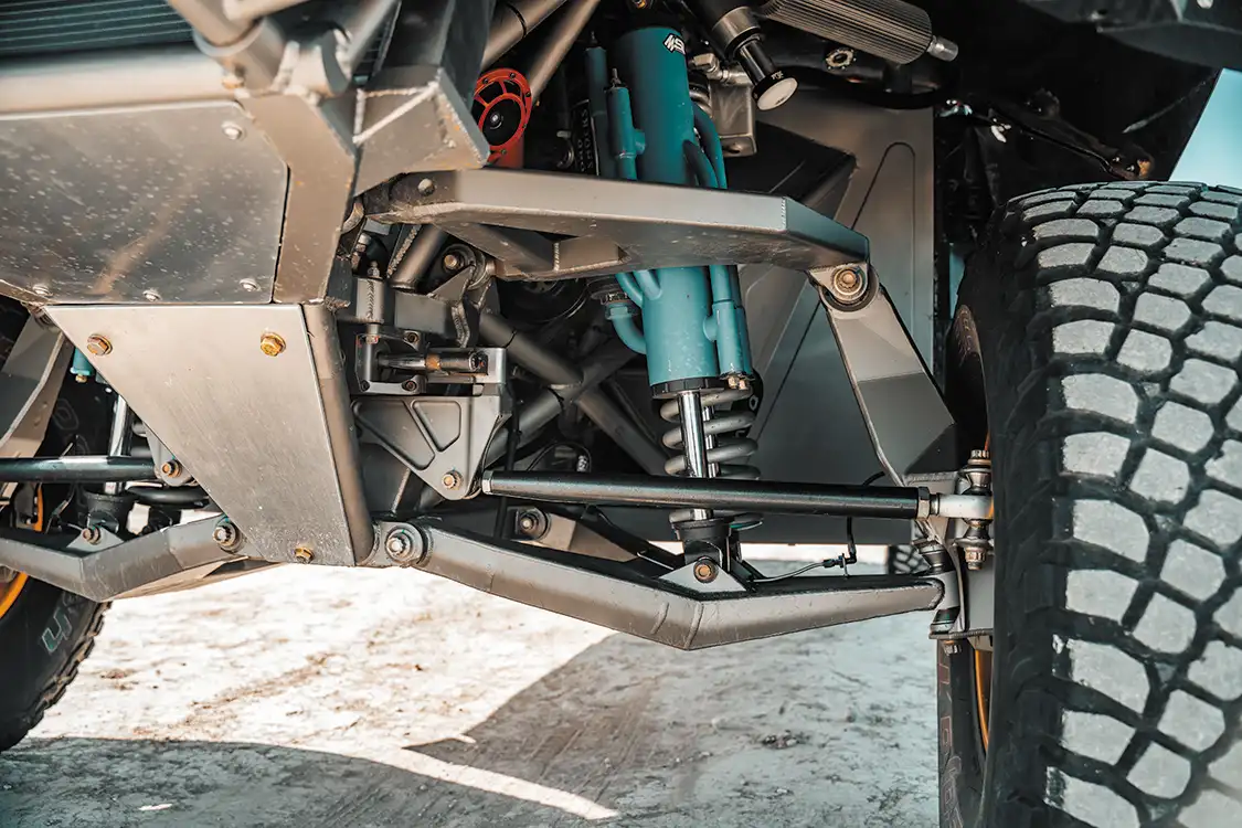 Of course, the entire OEM suspension setup was gutted. In its place, Paul assembled a massive upgrade from stock using a Dirt King tubular frame, a center-mount A-arm front setup, a 4-link system at the rear, and a trophy truck steering rack from Power Steering Solutions. King shocks and springs have also been thrown into the mix, as have 17-inch Innov8 G400 wheels and 40-inch BFG KR3 tires. Wilwood braking components bring this beast to a controlled halt, and a Harmon Racing 50-gallon fuel cell ensures that Paul can send his truck flying into the night without worrying about gassing up so soon.