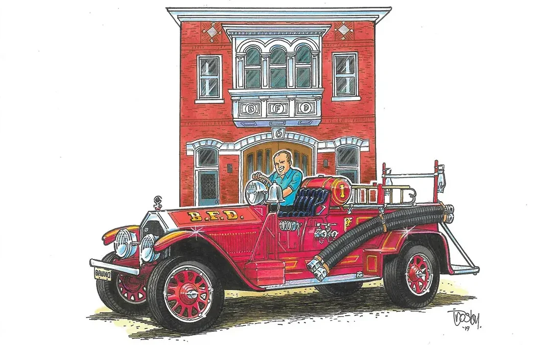 T: Most of my cartoons feature cars but the humor is usually about the people who own, build and love them. – A man is running out of a burning building carrying a load of precious car parts saying to the approaching firemen, “Quick….