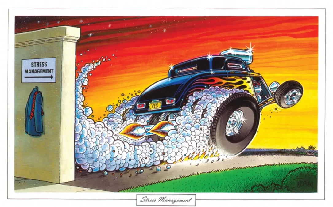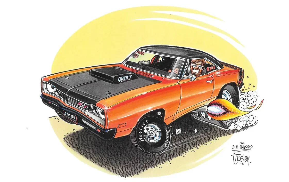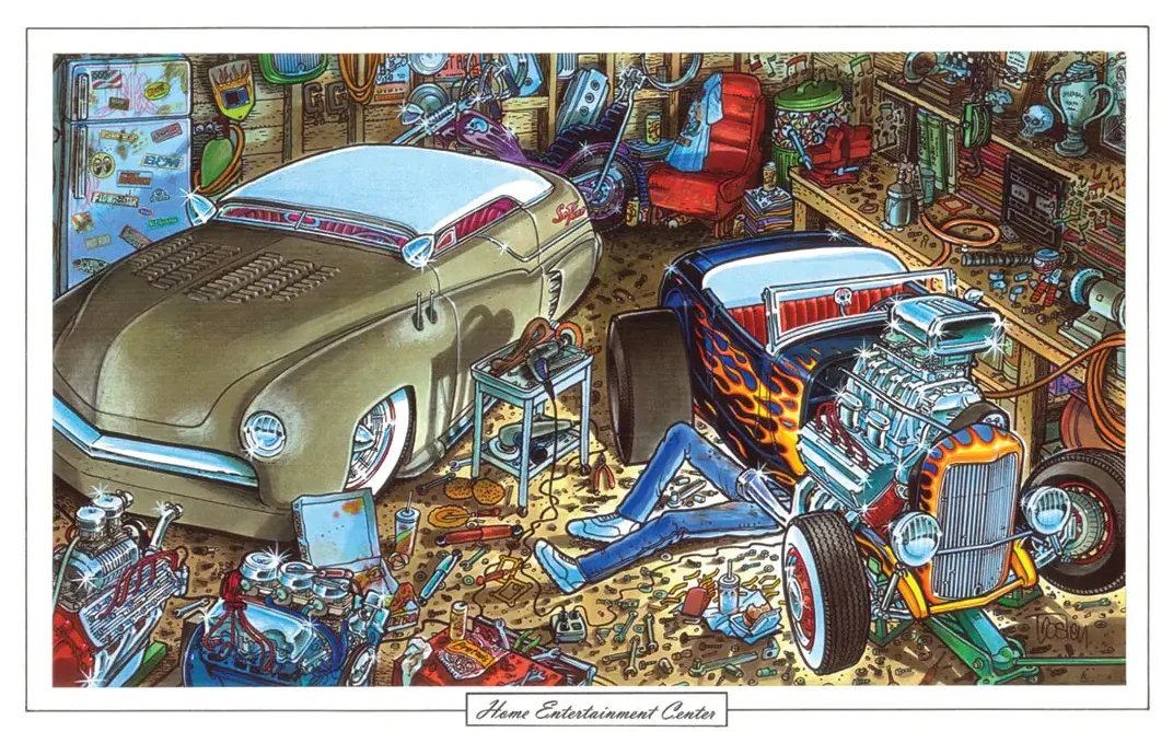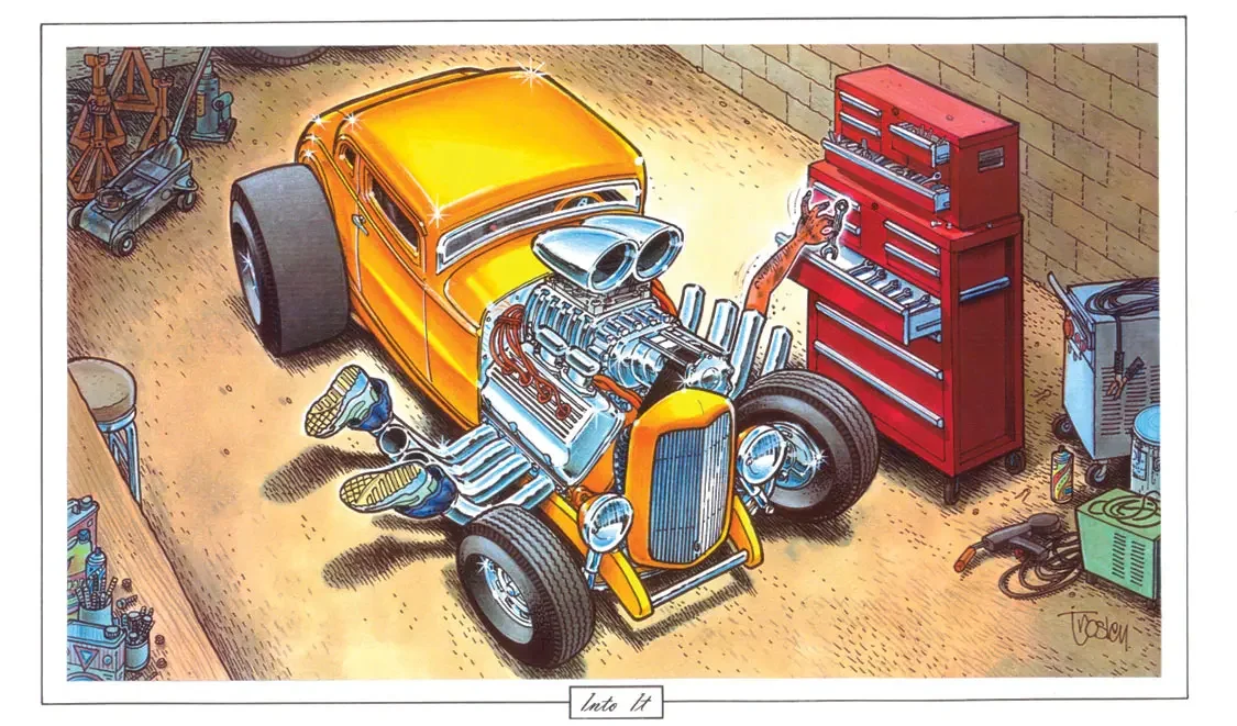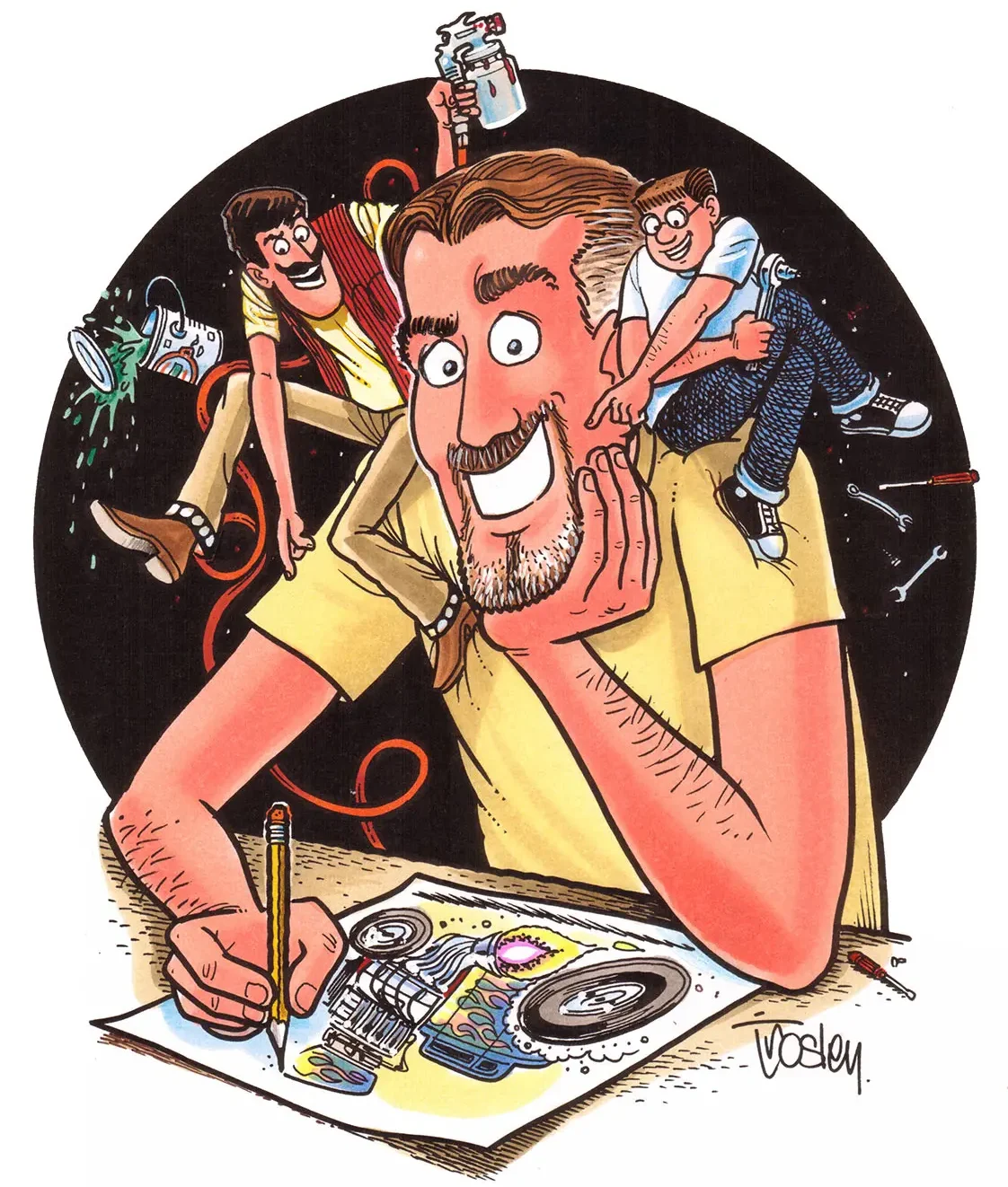 “I’d always been a major fan of Pete Millar and Petersen CARtoons, so I dropped it into gear. Eventually, editor Dennis Ellefson gave me the opportunity to do some of my reoccurring characters. I created Krass and Bernie, largely patterned after my brother and me. They ripped apart and rebuilt tons of wild rods for the next 20 years…and I loved it! During this period I also produced hundreds of cartoons and humorous illustrations for various other car magazines including Rod&Custom. My other work has been published in a variety of magazines such as the Saturday Evening Post, Saturday Review, National Enquirer, New Woman, and Hustler.”