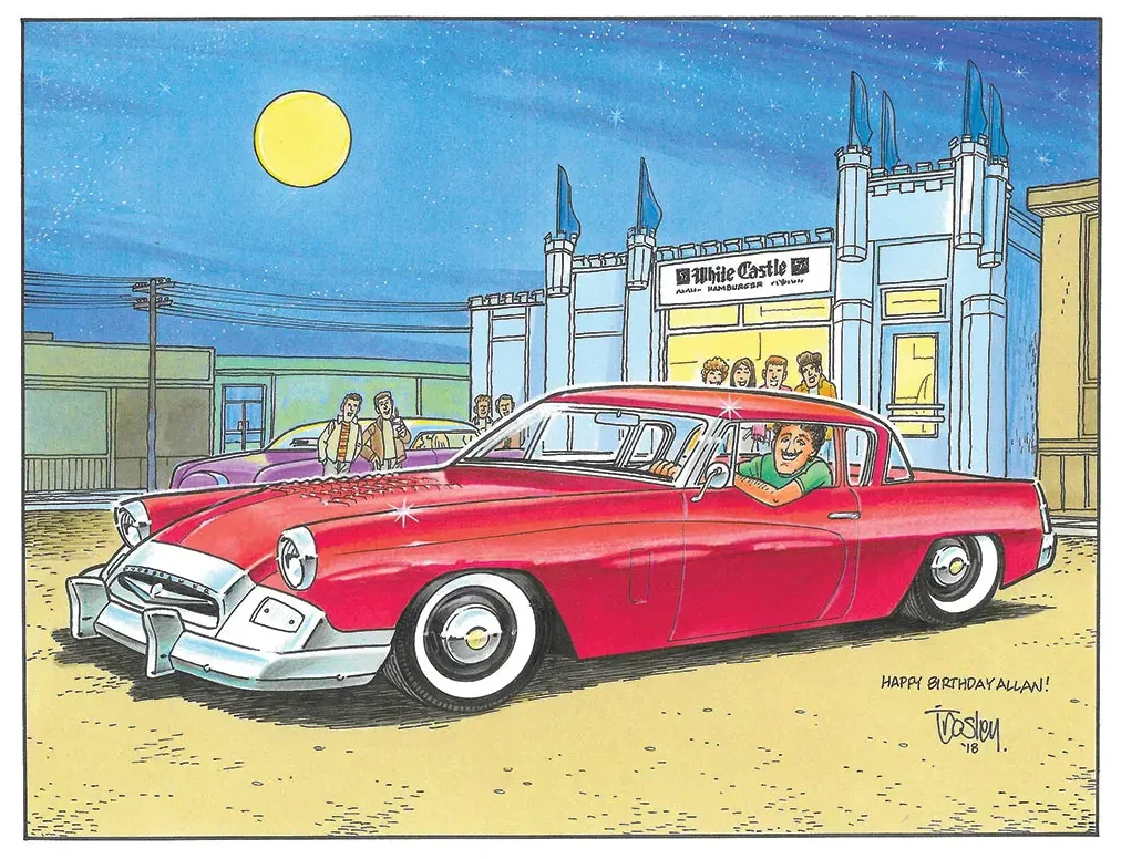 T: It’s so cool to receive a bent up photo of somebody’s Dad’s High School ride and graduation picture and then putting together a drawing of him in front of a hamburger joint where he hung out as a teen. We often get a note from the dad who gets it as a gift telling us how much he digs it.