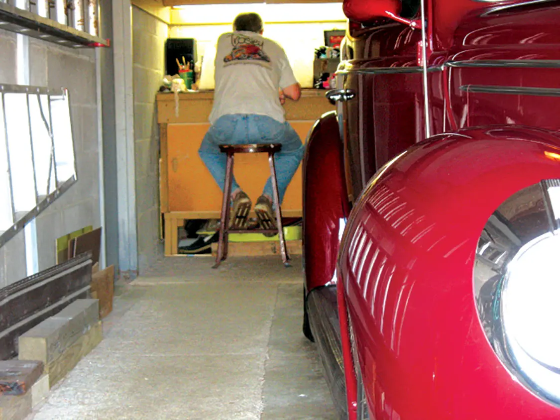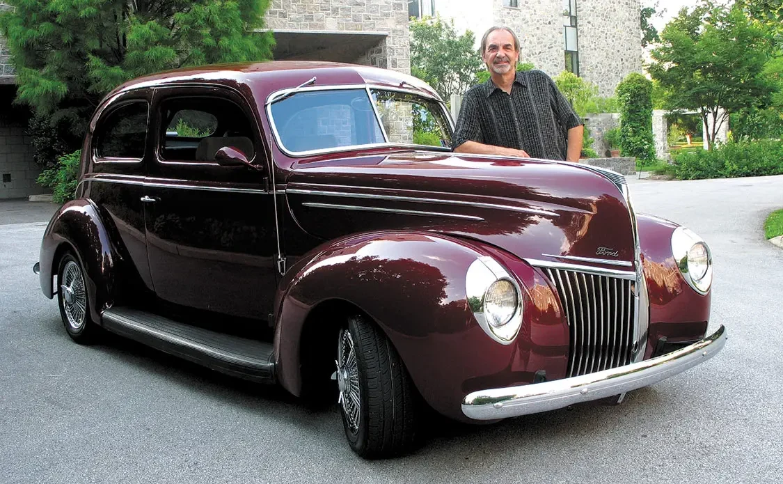 T: My taste in cars is kind of tame actually. I presently drive another ‘39 Ford Tudor, maroon with a 350 Chevy engine auto trans, Ford nine inch rear and Mustang II front suspension, chrome reversed rims with Merc dogdish hubcaps and blackwalls and a slight rake do it for me.
