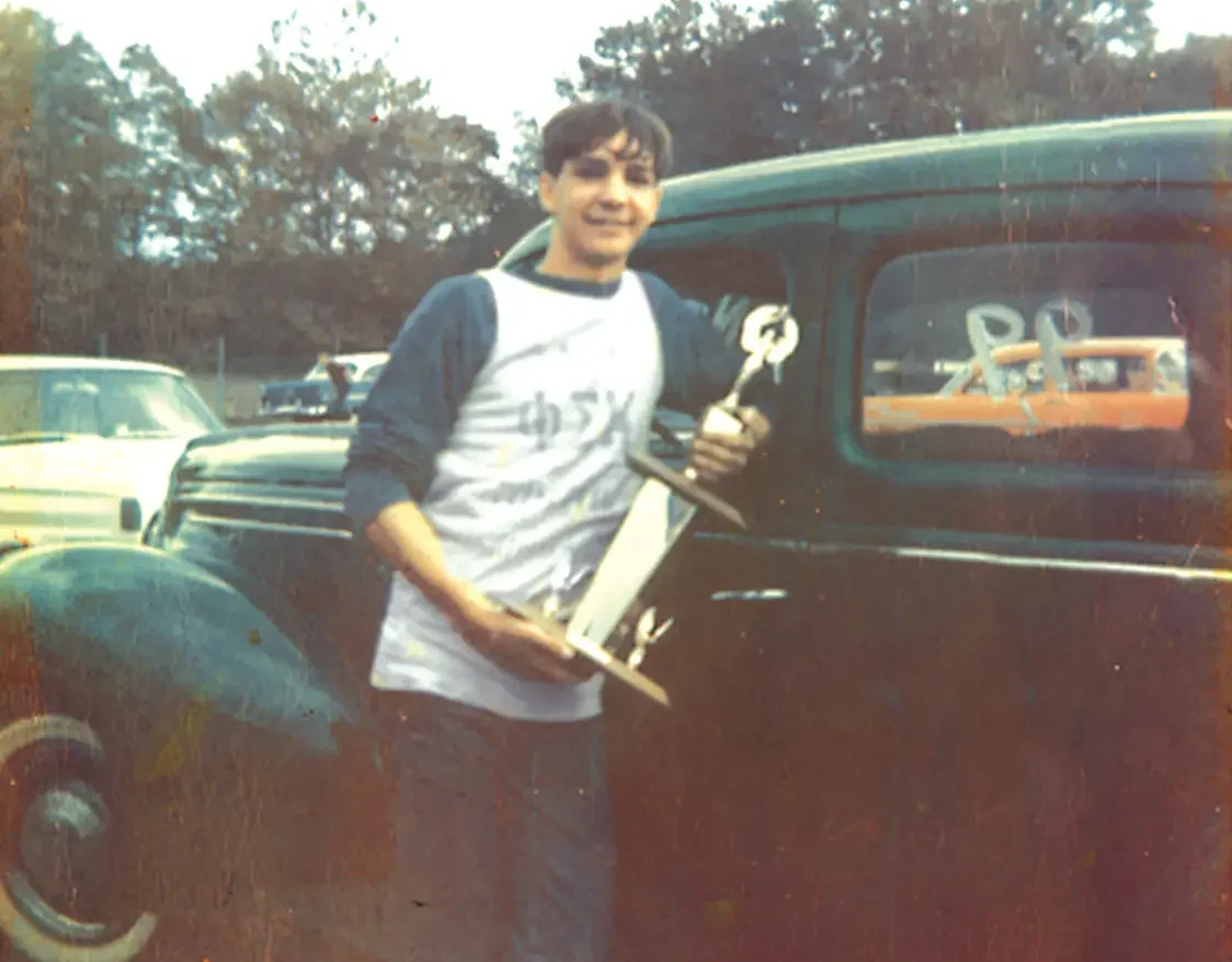 T: I’ve only drag raced once. I’d gotten a rebuilt flathead short block through the local Ford dealership for my ‘39 Ford and had almost put on the thousand break-in miles when my brother and I decided we should put the last of those miles driving it to the Cecil County Dragaway in Maryland and race it. Being still stone stock at this point they put us in the N/Stock Class. Garlits was there that weekend and things built until he blew down the strip at close to 200 MPH. As everyone began to head to the snack bar they ran N/Stock. I actually won the class with a blistering 68.07 MPH with a 19.76 second ET. My brother said I looked like Gartlits’ push truck following him down the strip. We drove home with a trophy and the decision to build it as a Street Rod. Although we never raced again… a few years later the ‘39 took third place at The Annual Philadelphia Convention Center Indoor Car Show.