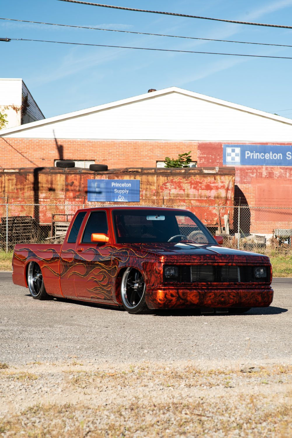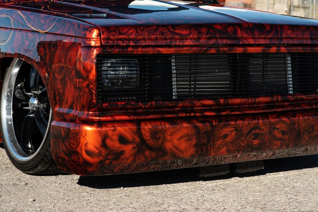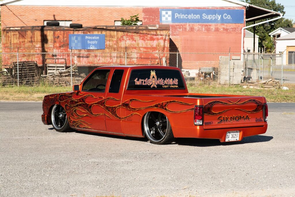 Exterior: OBS sectioned front bumper with phantom grille, all wheel wheels flared 1 ½ inches, shaved tailgate, smoothed roll pan, custom sheet metal bed,