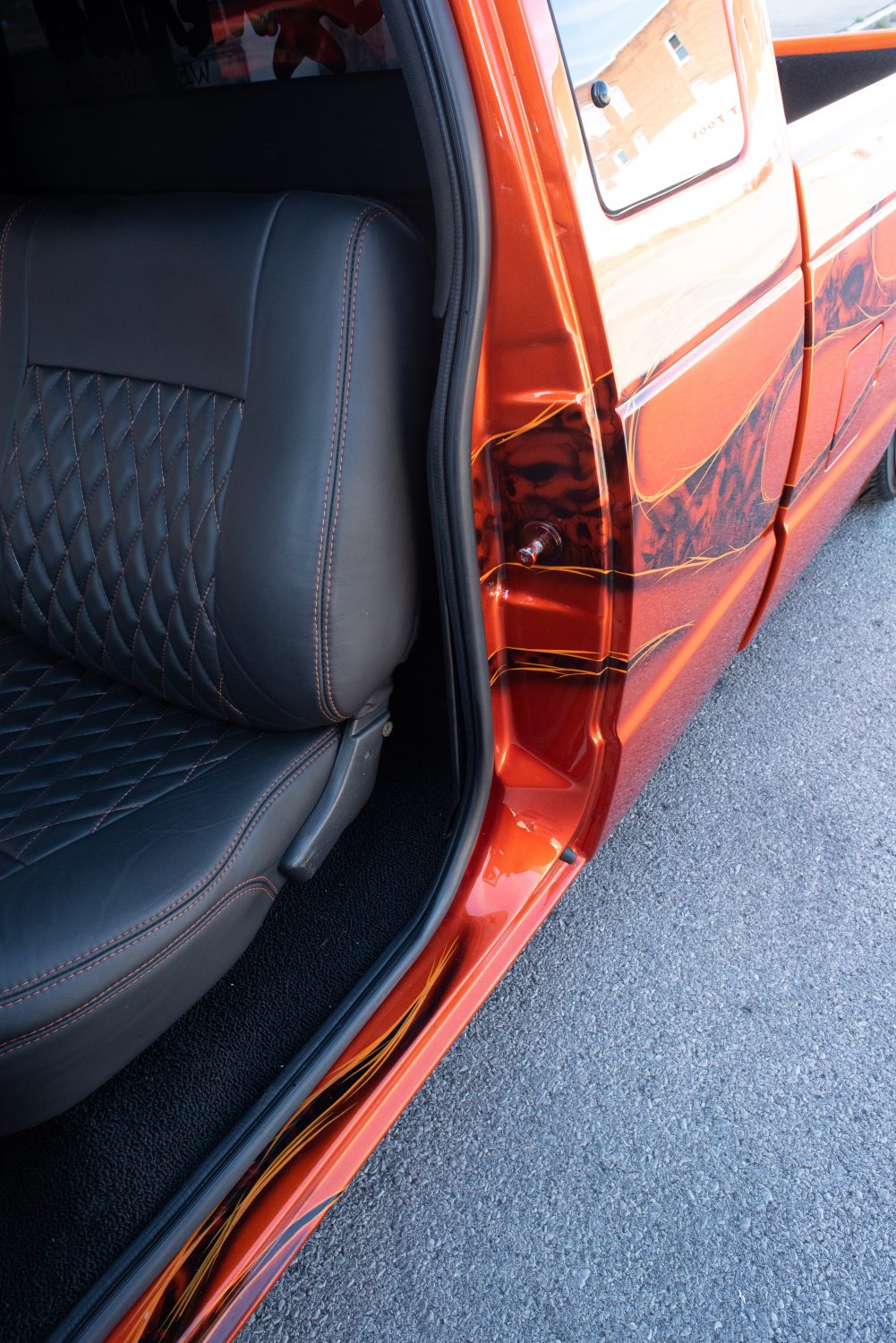 Interior: Custom Leather with black and orange stitching on bench seat and door panels. With custom paint and graphics in the interior. Billet accessories. Custom painted dash with custom Dakota Digital gauges.