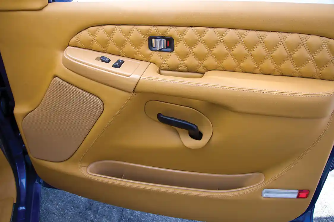 For many builders, choosing the interior is one of the most important decisions of a build because it’s where they’ll spend most of their time once the truck is finished. Everardo didn’t take the task lightly. After much deliberation, he went with smooth, light tan leather for most of the cab, including the dash, seats, headliner, door panels and even the custom Cadillac Escalade center console. For an extra fillip of flair, he had the team at RGV Upholstery add quilted diamond stitching on top of their already excellent work. With billet touches on everything from the AC vents to the steering wheel, it’s difficult to remember that the interior used to be pewter colored. One week later, the guys at Audio Shop in Pharr, Texas, got to work installing a powerful setup consisting of multiple pairs of Orion speakers, as well as a massive pair of 15-inch Sundown Audio subwoofers.
