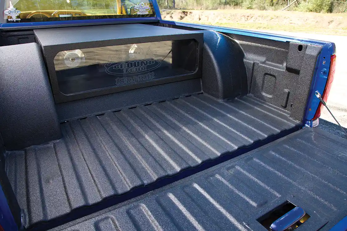 The icing on the cake was the paint, which was applied the day after Audio Shop completed the sound system. The truck went directly to KME Auto Body Specialist where it was transformed with a custom-mixed blue pearl. The only thing missing was the graphics, so Indio of Indio Designs stepped in to fix that little problem and laid down the silky gray and red graphics across the freshly painted bedside.