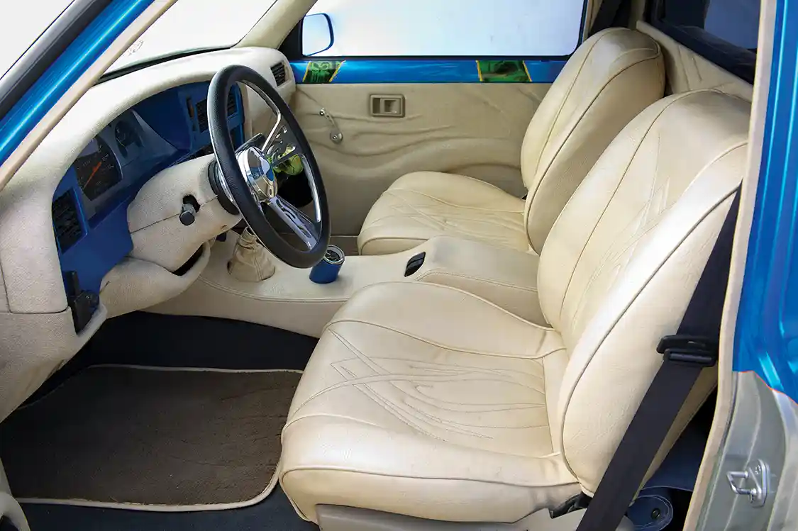 Though the truck’s body, paint and graphics had already been customized, Krasucky took on the project intending to add personal touches. His own shop, BK Customs & Collision, took control by adapting a front bumper from a 4WD Toyota 4Runner, which they sectioned to better match the body lines. The rear bumper, door handles and gas filler were shaved smooth. Fender lights, also from a 4Runner, were grafted and molded into the shaved tailgate for an ultra-clean rear exterior. Finally, a custom sheet-metal section was fabricated for the bed floor. After the labor-intensive bodywork and finish prep were complete, Krasucky’s Toyota was covered in a graphic combination of DuPont Scion Blue and Volvo Silver with orange highlights by Jackson’s Pinstriping.
