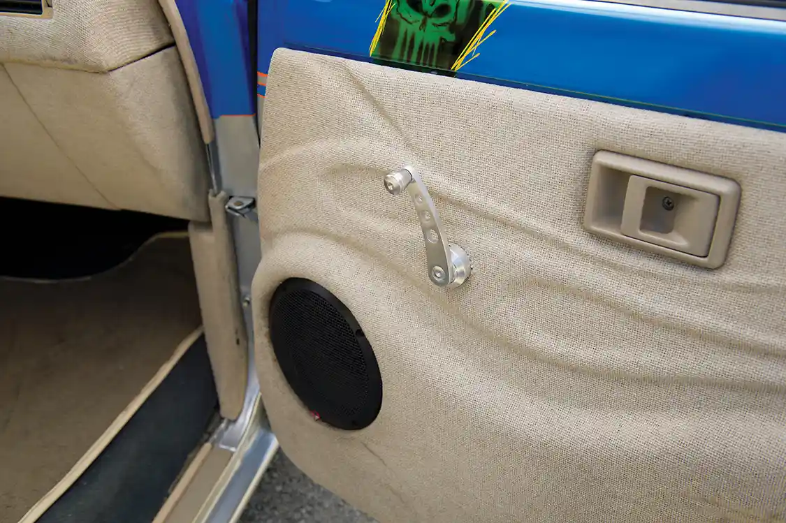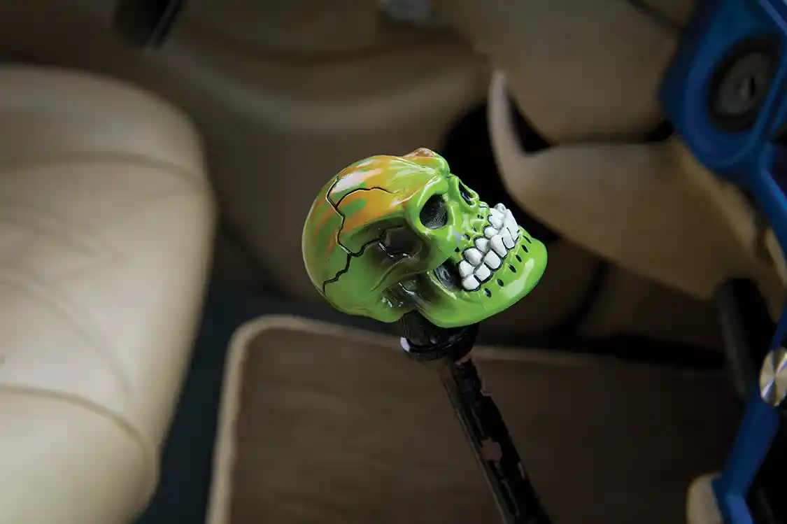 The fully customized interior complements the wild paint job and top-notch bodywork. The paint and graphic work extend over the tops of the door panels and beneath the windows. Tweed covers the custom-embroidered bucket seats and stretches through the dash. The dash bezels are paint-matched to the exterior’s blue-and-silver paint scheme. The final touches are a classic hot-rod-style shifter and Billet Specialties steering wheel.