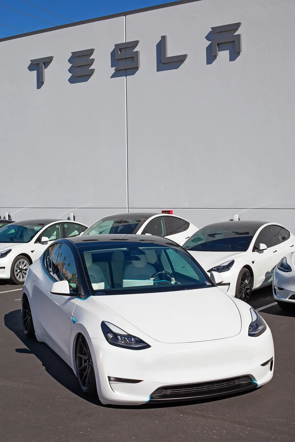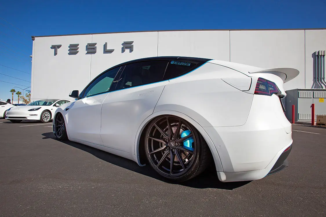 As an old-school mini-trucker at heart, Colby wanted Cold Shoulder to lay as close to the ground as possible. However, the Tesla Model Y’s air-ride suspension proved to be more challenging compared to its sibling, the Model 3. Determined to achieve the desired stance, Colby, Shawn Robinson (now running Old Man Customz), and the crew over at the Fab Lab had to heavily modifiy the suspension to allow the vehicle to properly lay out on the 21-inch wheel and tire setup.