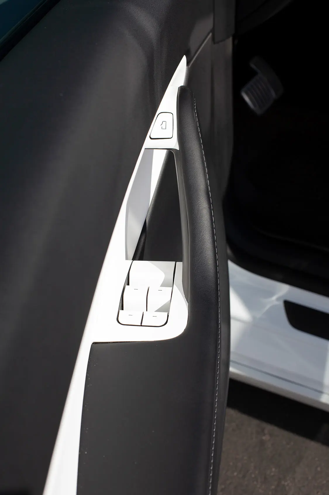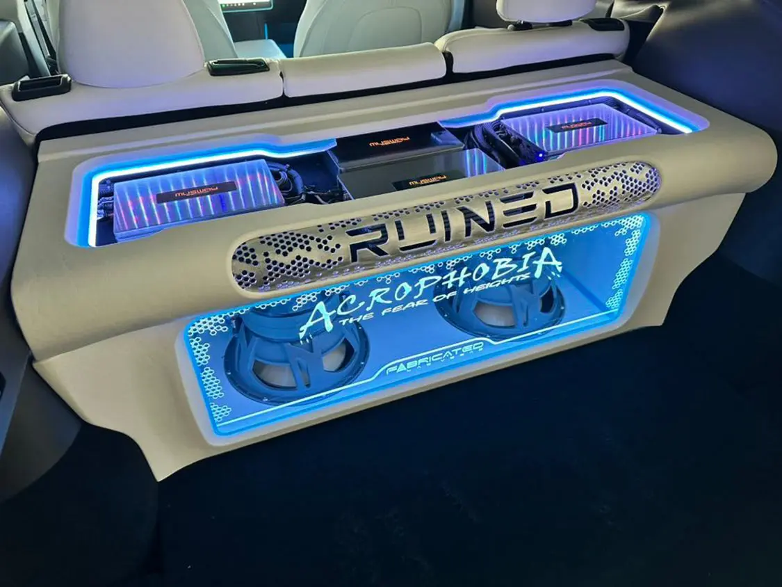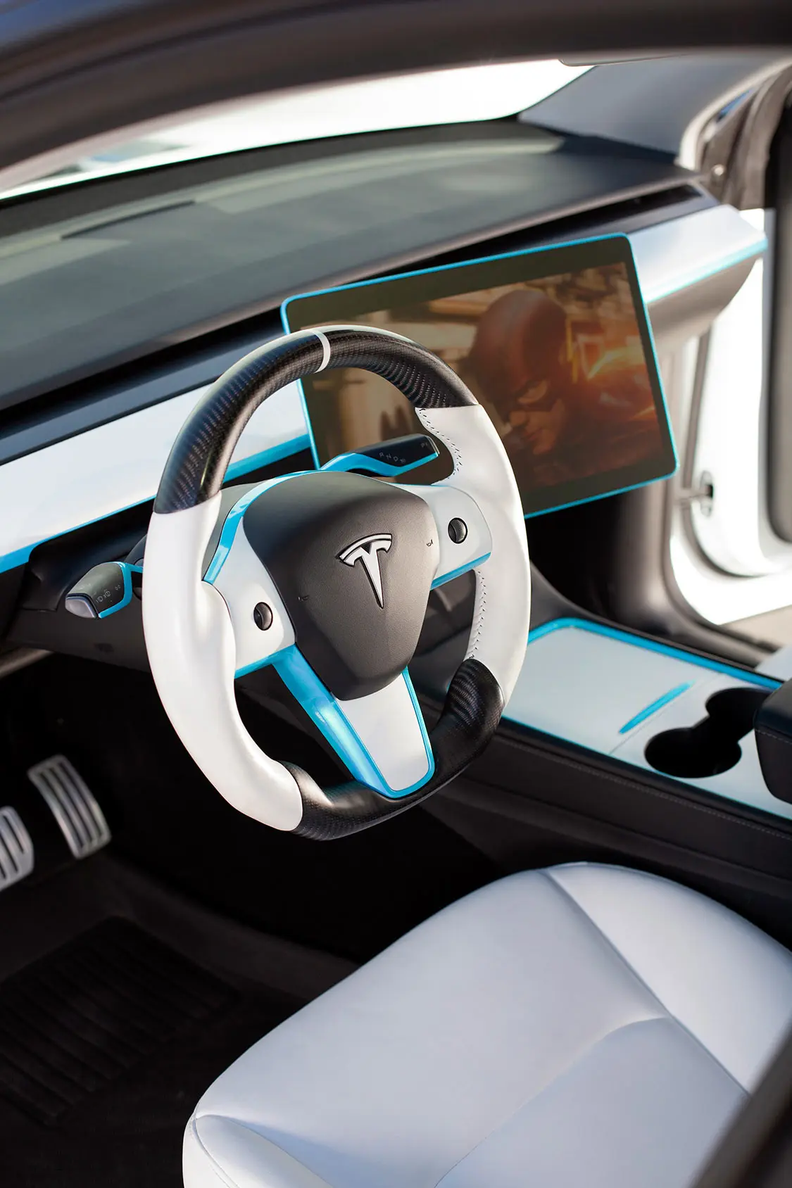 But the transformation does not end there. Step inside Cold Shoulder, and you’ll be greeted by a luxurious interior. Tesla white vegan leather seats adorned with aftermarket white leather seat back covers, provide comfort and style. The TAPTES touchscreen swivel mount has been wrapped in Caribbean Blue and Satin Frozen Vanilla, along with various pieces of trim, including door card finishers. The Tesery modified carbon fiber steering wheel, also wrapped in white leather, adds a touch of sophistication. Ice Blue ambient lighting sets the mood, illuminating the dash, rear seats, puddle lights, and audio setup in the trunk.