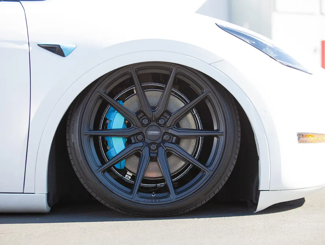 Required in the modifications was cutting the suspension mountings and raising them up a couple of inches, and then welding them back into place and installing the air-ride setup. Having to change the tire size to 265/30/ZR21 up front and 275/30/ZR21 in the rear was required as well to retain the inner fender wells and help the vehicle drop fully onto the ground when aired out. No custom build would be complete without attention to detail, and Cold Shoulder does not disappoint in that regard. Vossen hybrid forged HF-4T extra-deep rims wrapped in Michelin Pilot Sport 4S tires grip the asphalt with confidence. Tesla Performance Sport brakes, clad in TeckWrap RB09-HD Caribbean Blue vinyl, provide the stopping power needed for this speed demon.