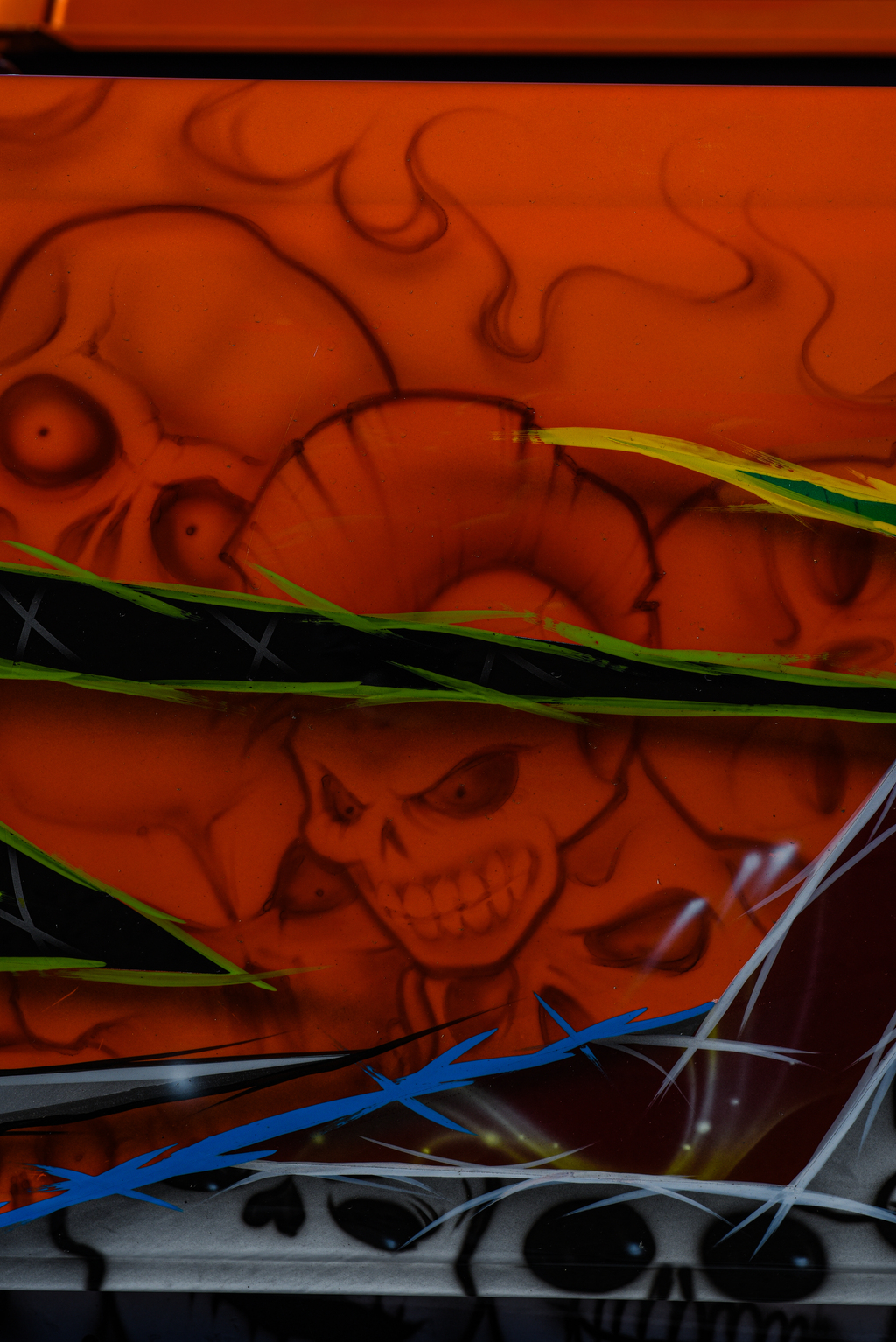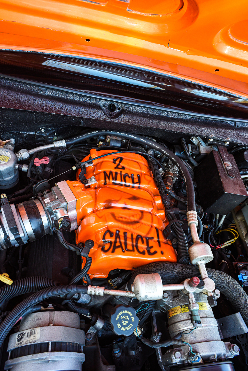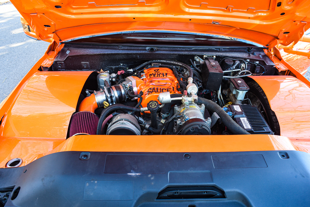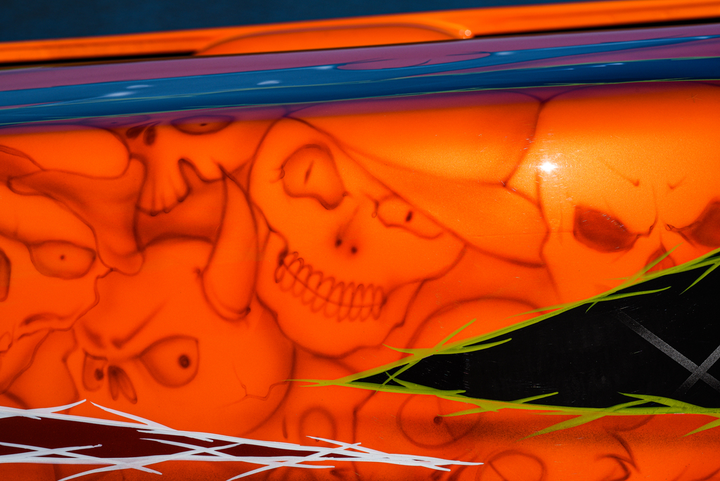Exterior: 05 GMC Sierra Grille, Custom front bumper, custom front wheel tubs, back bumper shaved, rear doors suicide, ragtop, HOK Tangelo Orange with pearl white, candy blue, candy red skulls and graphics performed by Wilsons Bodyshop