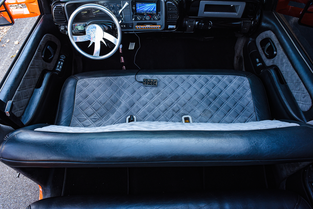 Interior: Bench seat front and rear covered in leather and suede, custom door panels and painted dash.